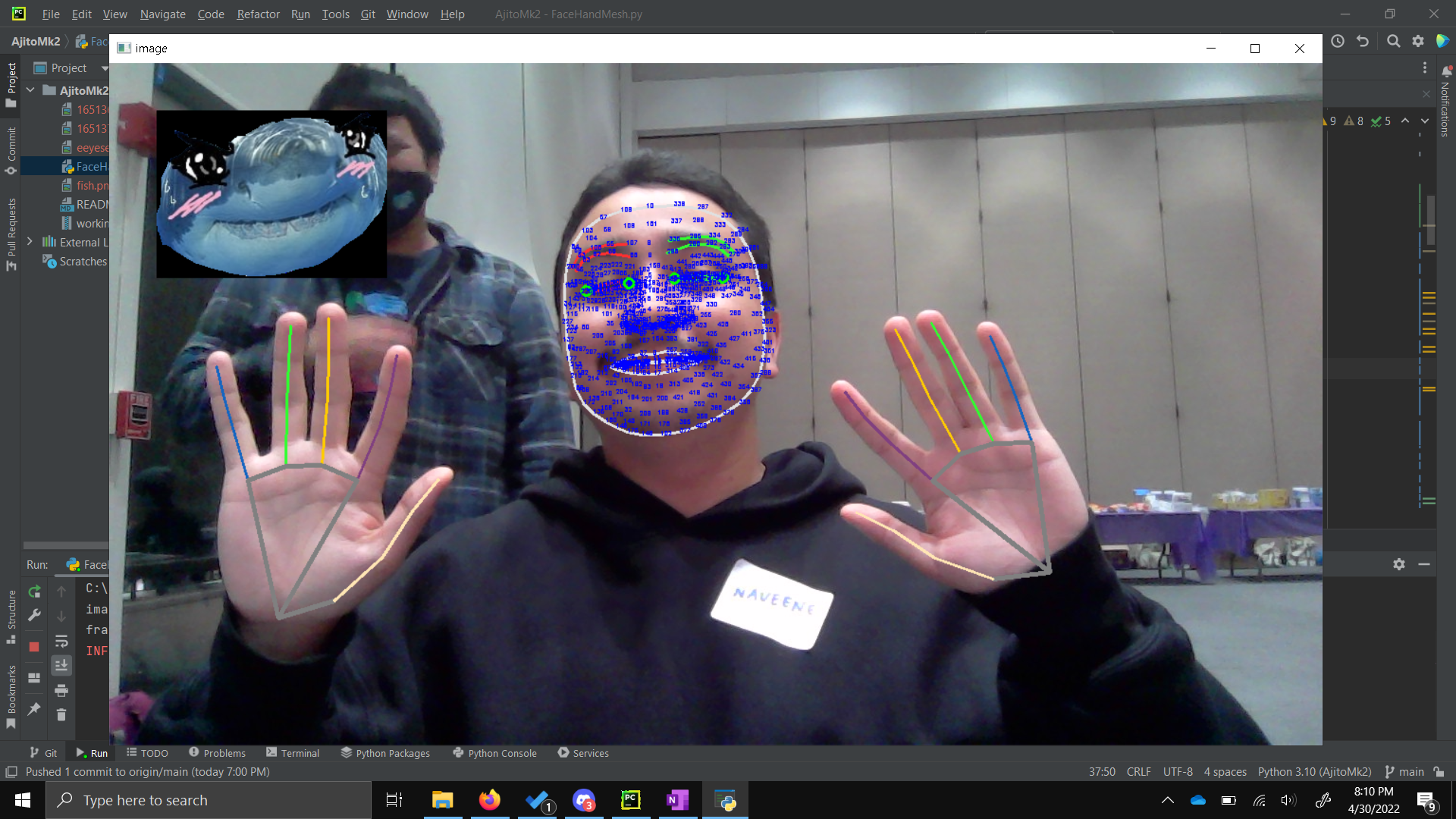 By using facial recognition and motion capture, we were to plaster the face of a shark onto the face of any cal state long beach, as well as turn their arm into a sword.