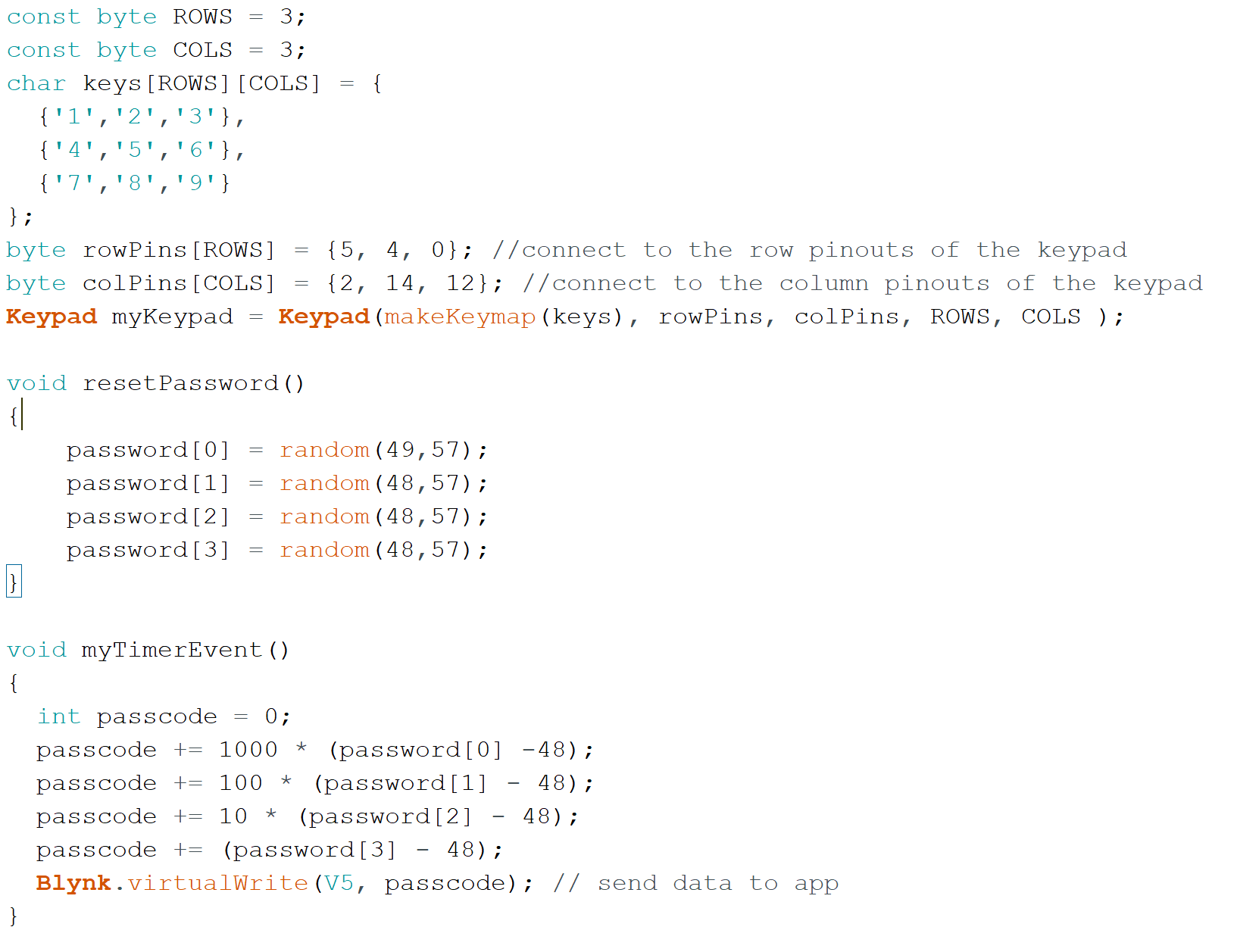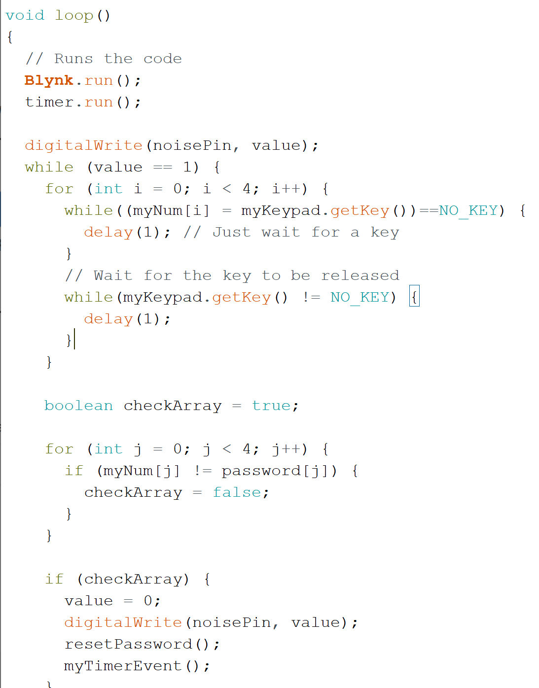 Our project is an IOT-enabled alarm clock. At a time set by the user, our clock sets off the buzzer. The NodeMCU is connected to a phone via Blynk and displays a randomly-generated, 4-digit passcode. The user must input this code with the attached keypad in order to turn off the alarm. They have an unlimited number of attempts to do so--the passcode will remain the same. Once they input the right passcode and the alarm turns off, a new one will be generated for the next alarm.