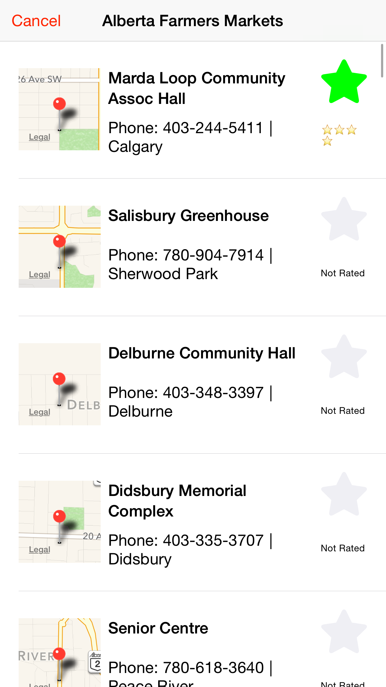 Discover local farmer's markets of Alberta, Canada. Selecting one of these markets allows you to share the experience through pictures, navigate to the markets from your current location, rate and review the experience. Great finds are easy to share with your friends and social networks. Alberta FMR can be used to help consumers find local produce and promotes healthy eating by connecting customers with farmers markets in Alberta, Canada.