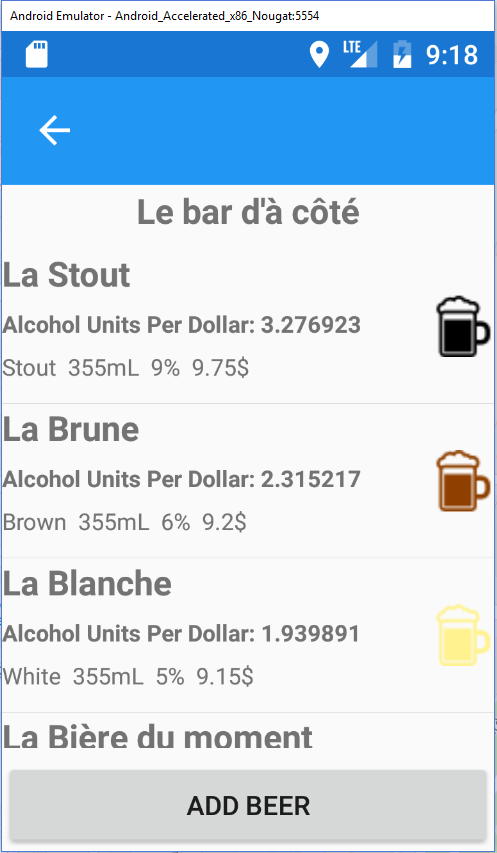 This app lets users add existing bar to a database and the available beers at those bars. The app calculates the number of units of alcohol for your dollar and orders them from the most profitable to the lesser one. The type of the beer is also available! That way, you won't order a type of beer you won't like!
