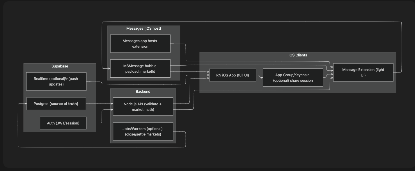 So we put prediction markets where they already belong: inside the group chat. A bet isn’t a spreadsheet or a trading terminal. It’s a message bubble. It’s something you tap while waiting for the bus. It’s a question that sparks conversation, trash talk, reflection, and sometimes surprise. The “odds” aren’t pretending to be the truth. They’re a mirror of the group’s confidence at that moment.