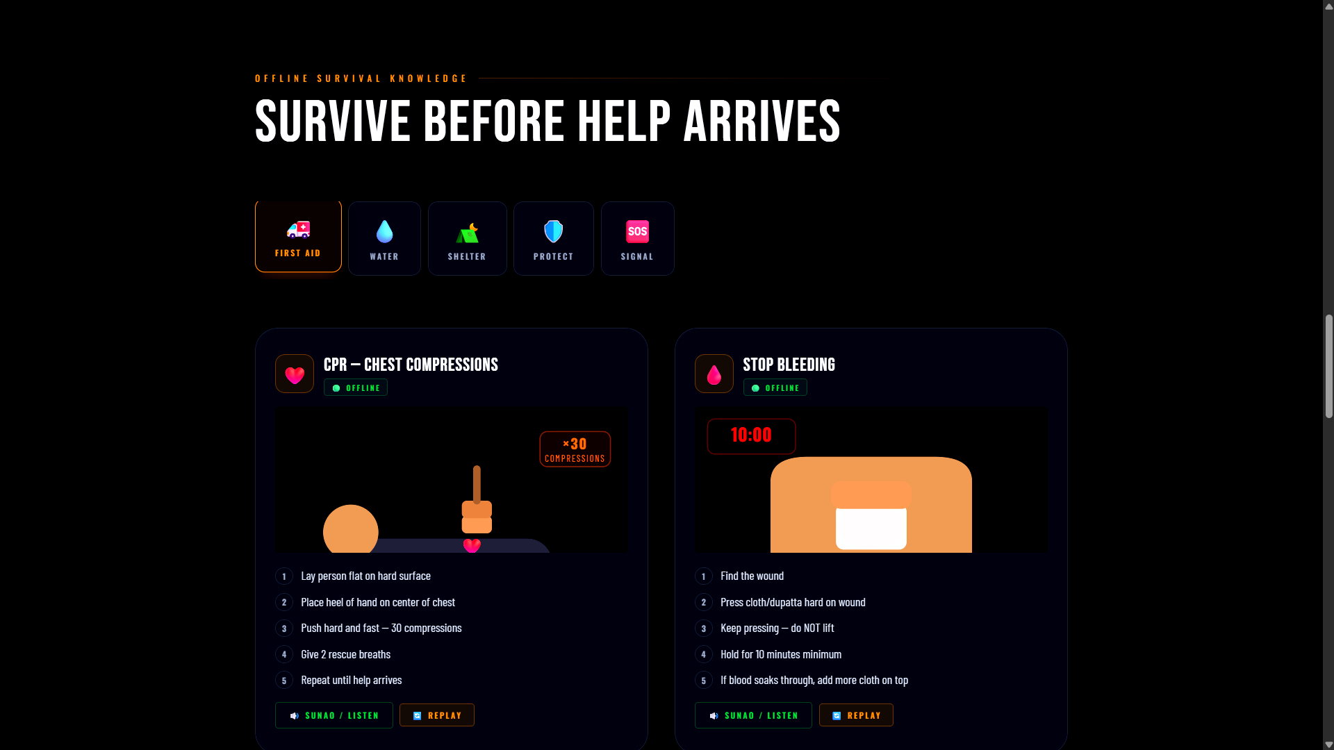 We are incredibly proud of our Dynamic Offline Survival Guides. We took standard PDF survival manuals (like "How to do CPR" or "How to boil water") and turned them into beautifully animated, interactive modules. Thanks to our AI pipeline, even these offline manuals dynamically translate themselves into the user's selected language instantly.