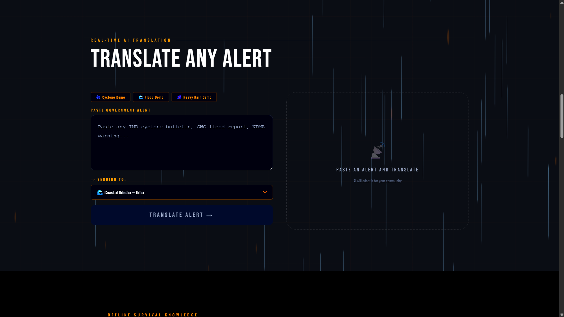 Every year, 400 million people living in disaster zones receive robust alerts from the government. But imagine being an Odia fisherman or a Maithili-speaking farmer and receiving an SMS that says: "Severe Cyclonic storm forming at 13.5°N. Anticipated barometric drop. 110kmph gusts. Evacuate."