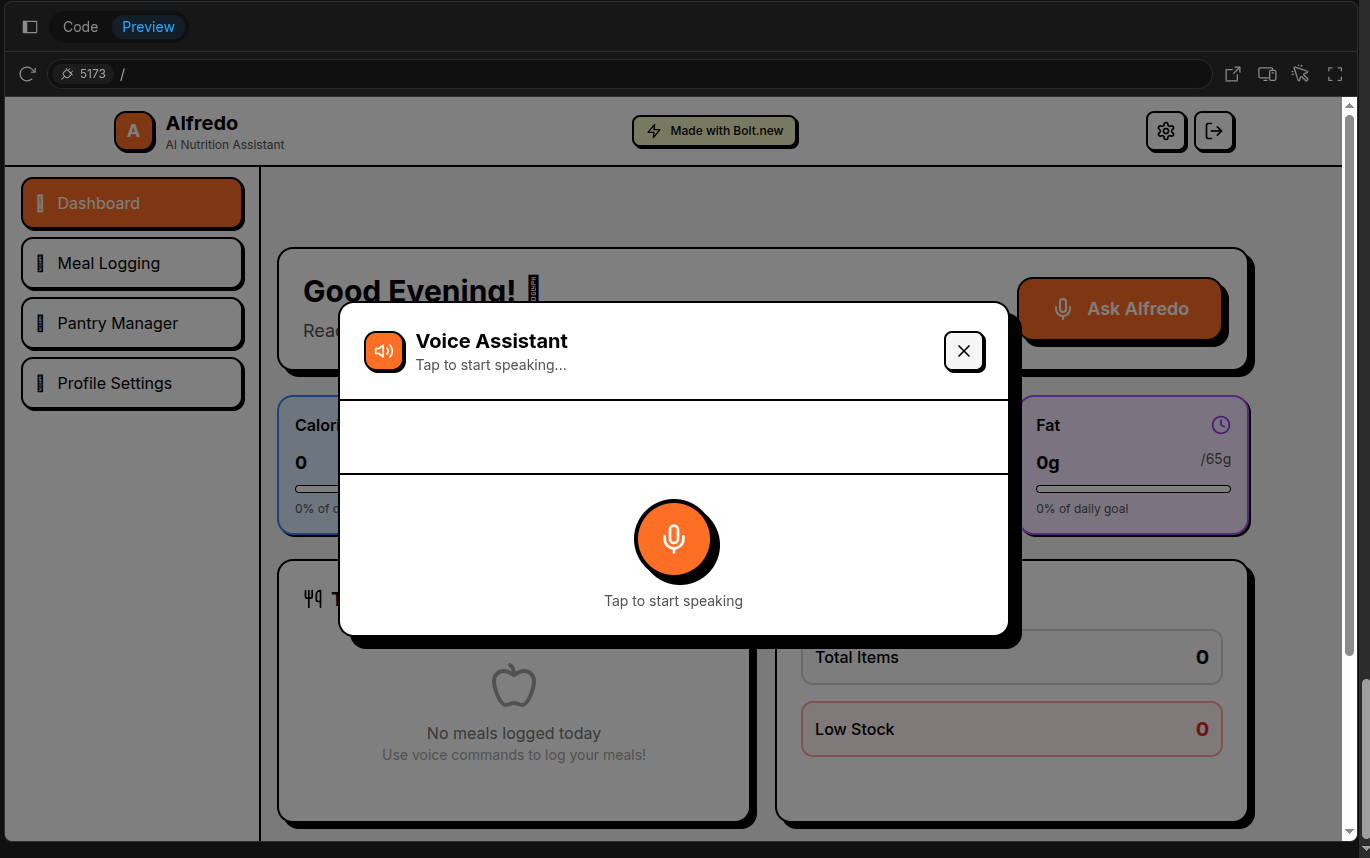 As a student living far from my family and familiar surroundings, I often found myself struggling to keep up with healthy eating habits. Managing groceries, planning meals, and tracking nutrition became extra challenging without the support systems I had at home. I realized that many other students and young professionals face similar difficulties, especially when adjusting to independent living. This inspired me to create Alfredo—an AI-powered nutrition assistant designed to make food management easy, intuitive, and accessible for anyone, anywhere.