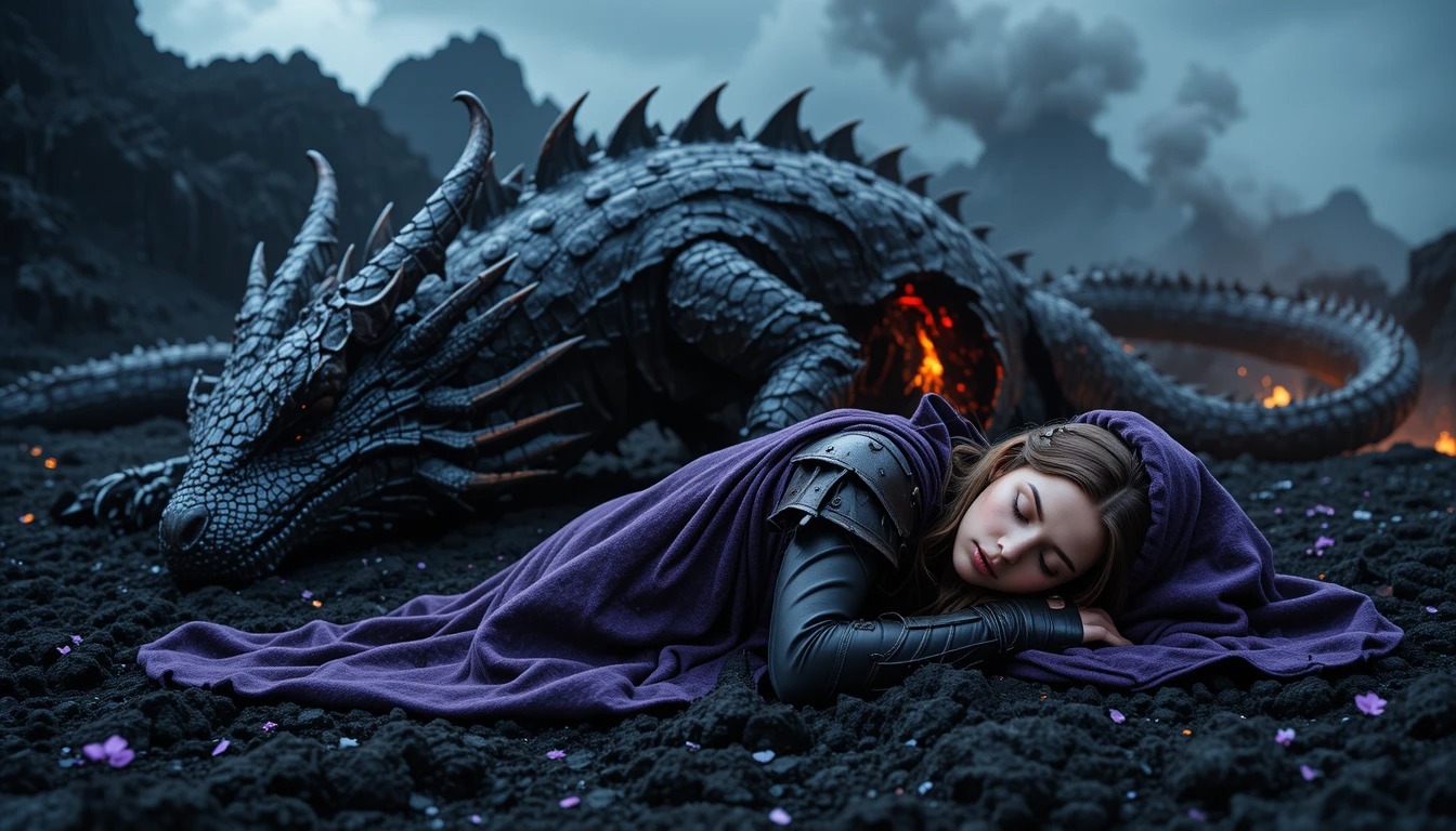 The brave warrior injured and motionless following an epic battle with the dragon