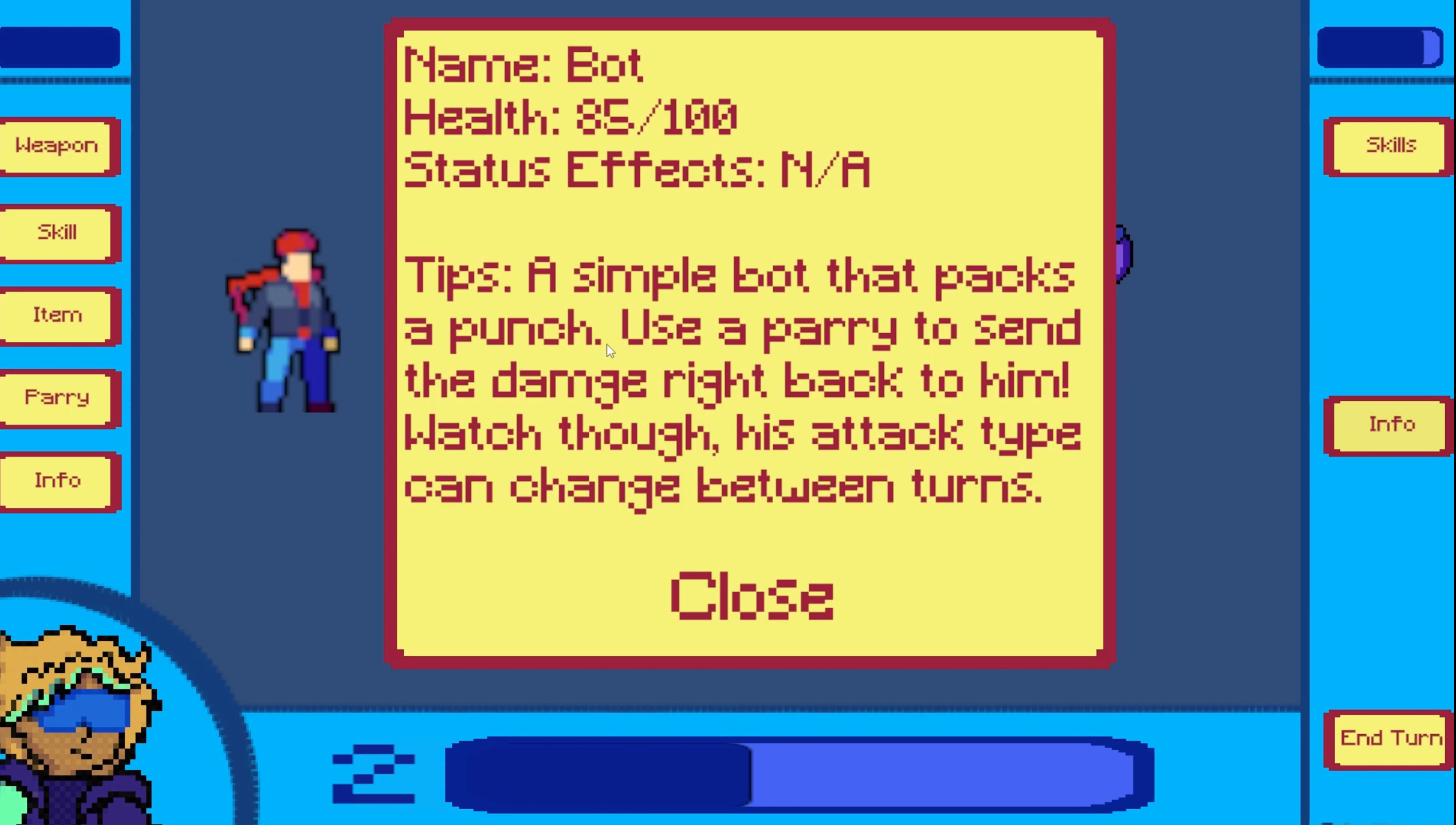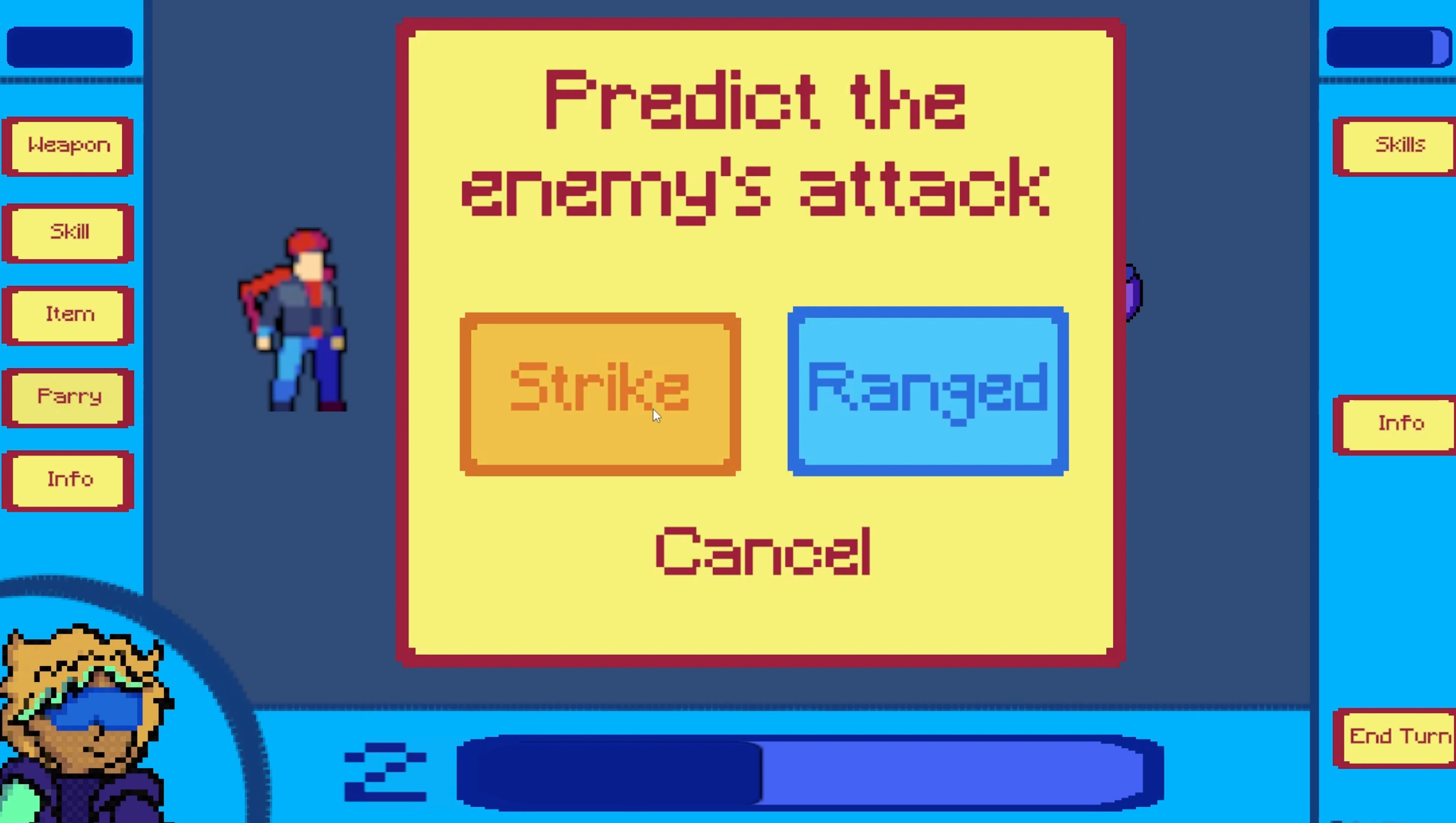 - When an enemy attacks, the player can attempt to parry by guessing whether the attack is close-range or ranged