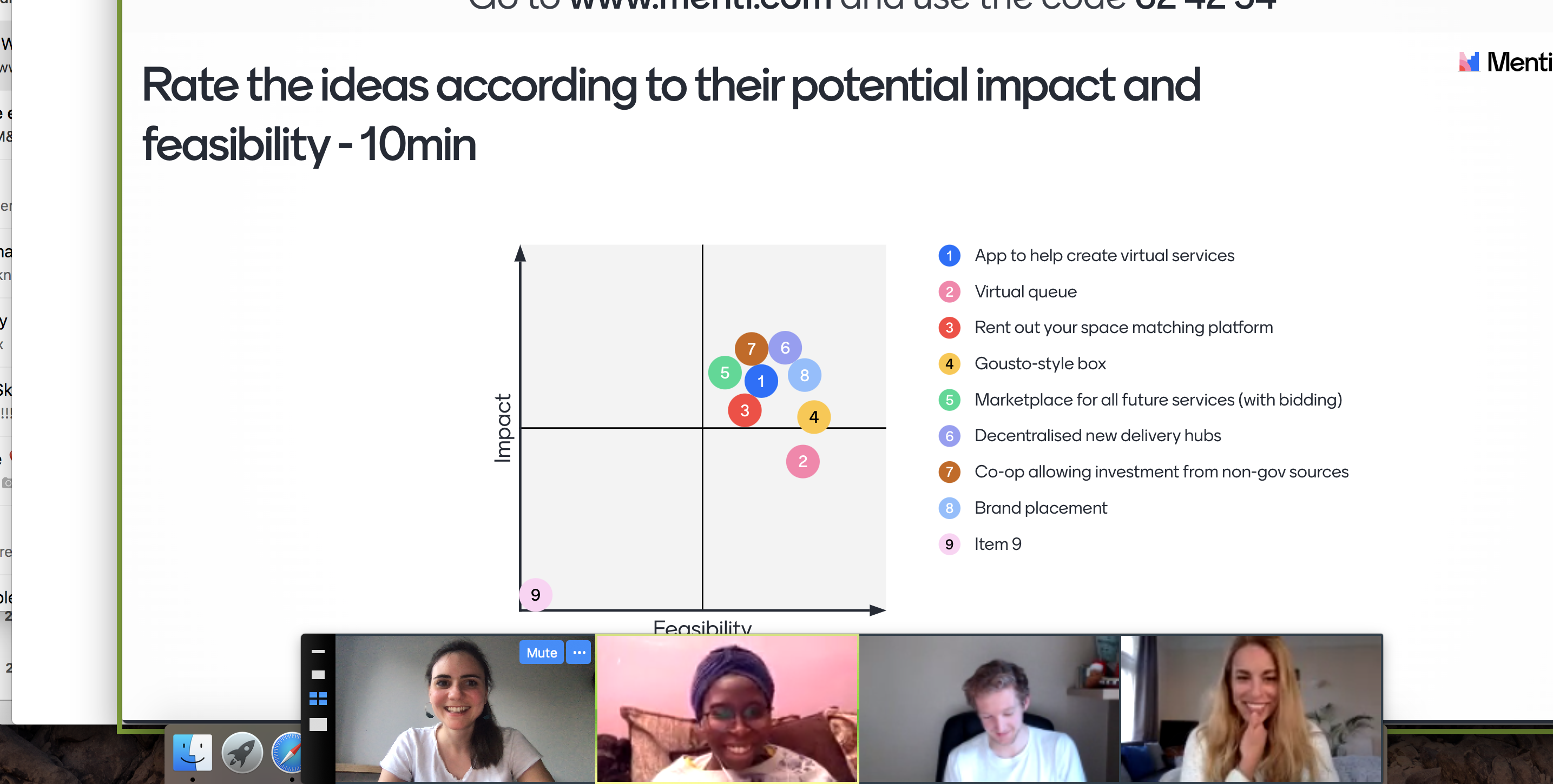 We started from scratch on Friday with a virtual silent brainstorming session on Mentimeter and evaluated ideas in terms of potential impact and feasibility to help us select one.