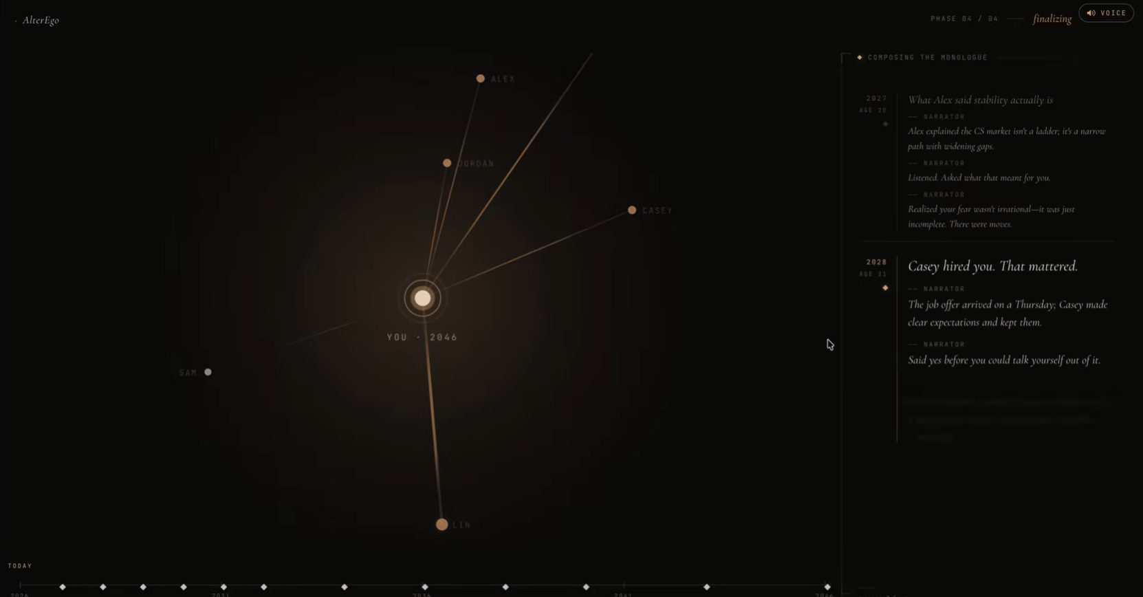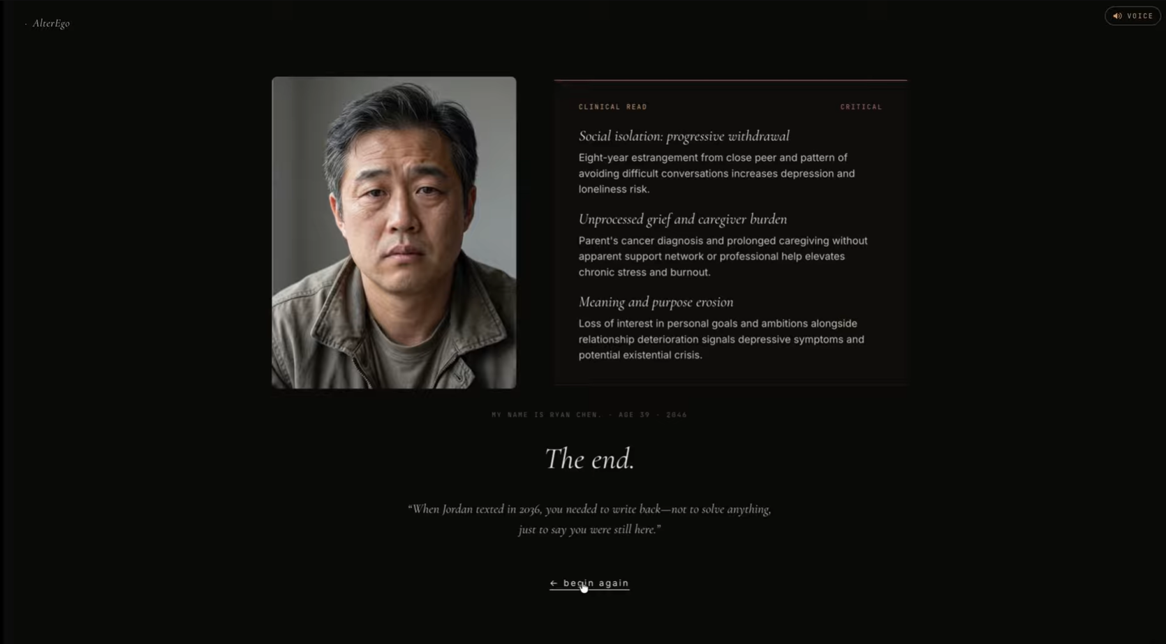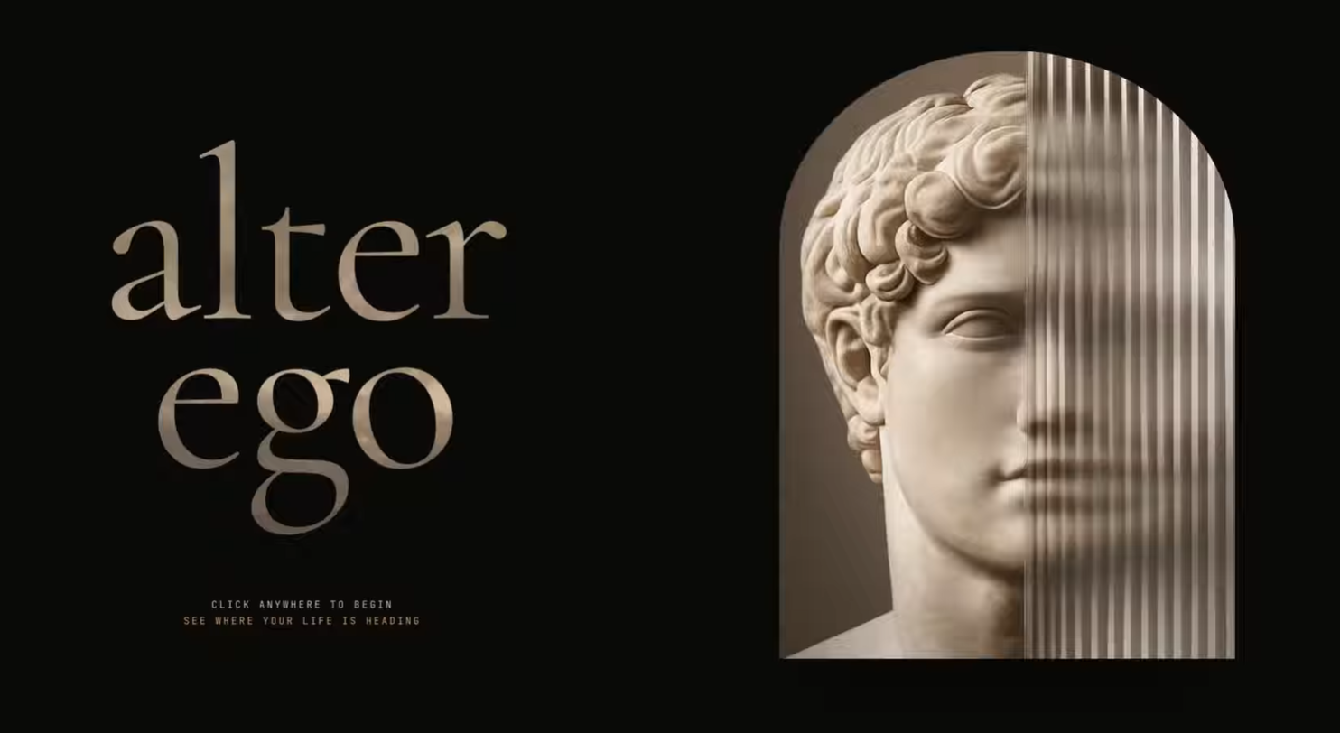 The thesis behind AlterEgo is simple: we make better decisions when we have a memory of where they lead. We don't get one. So we built one: a simulator that takes seven honest answers about your present, projects your life out twenty years, and lets you sit across from the person you become if nothing changes. Aged by Gemini. Voice cloned by ElevenLabs from your intake answers. Not motivational. Just what happened.
