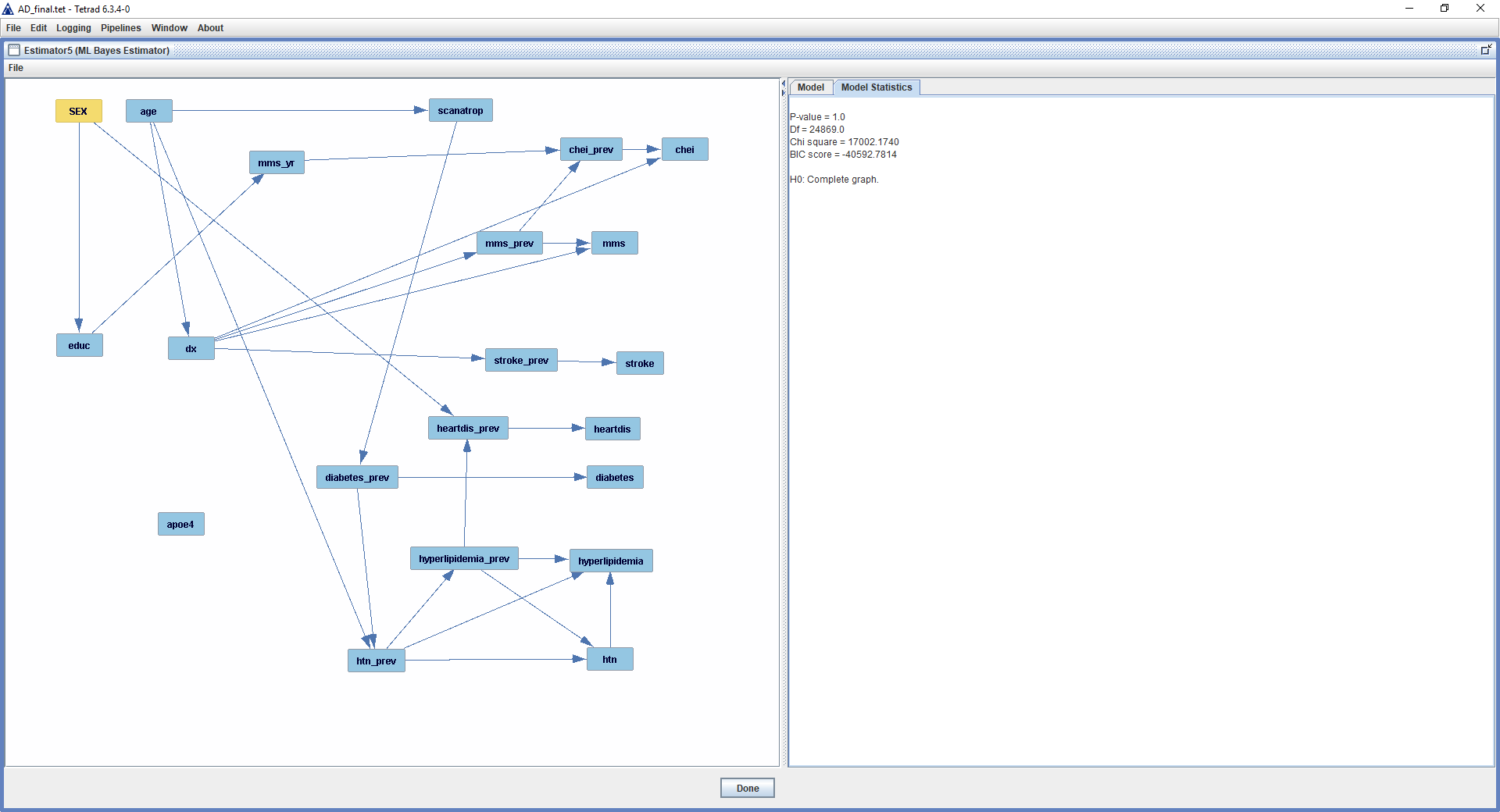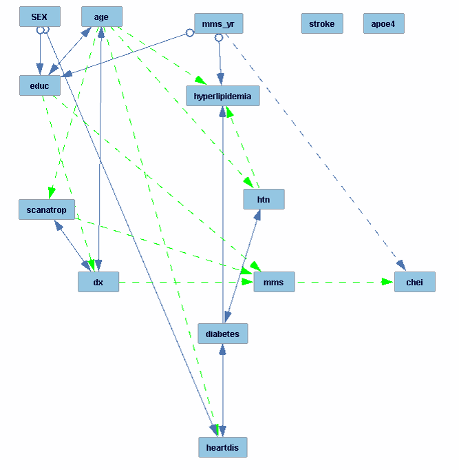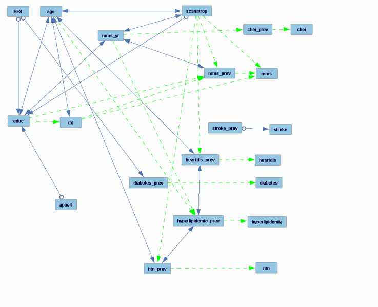 The continuous variables were normalized before analysis. Since the data set is longitudinal and the number of observations was different among patients, I built the model in two parts: 1. a ground model that links the baseline measurements with the patient characteristics; 2. a transition model that predicts the measurements of the next time point given the current time point, under the Markov's assumption. Then, the RFCI algorithm was used to search the two datasets for these two models. I added 4 tiers in the prior knowledge based on the time sequence of the variables, but I did not add any required or forbidden arrows. Next, in order to build a parametric model out of the learned causal structure, I discretized all continuous variables and randomly split the datasets 1:1 into training and validation sets. I then used the FGES algorithm to search the training sets for the ground model and transition model, respectively. Next, I used the ML Bayes algorithm to estimate the conditional probability tables from the corresponding validation sets. Both models showed very high goodness-of-fit (Chi-square close to 1). Finally, I was able to use the approximate updater function to make predictions on disease progression given patient information.