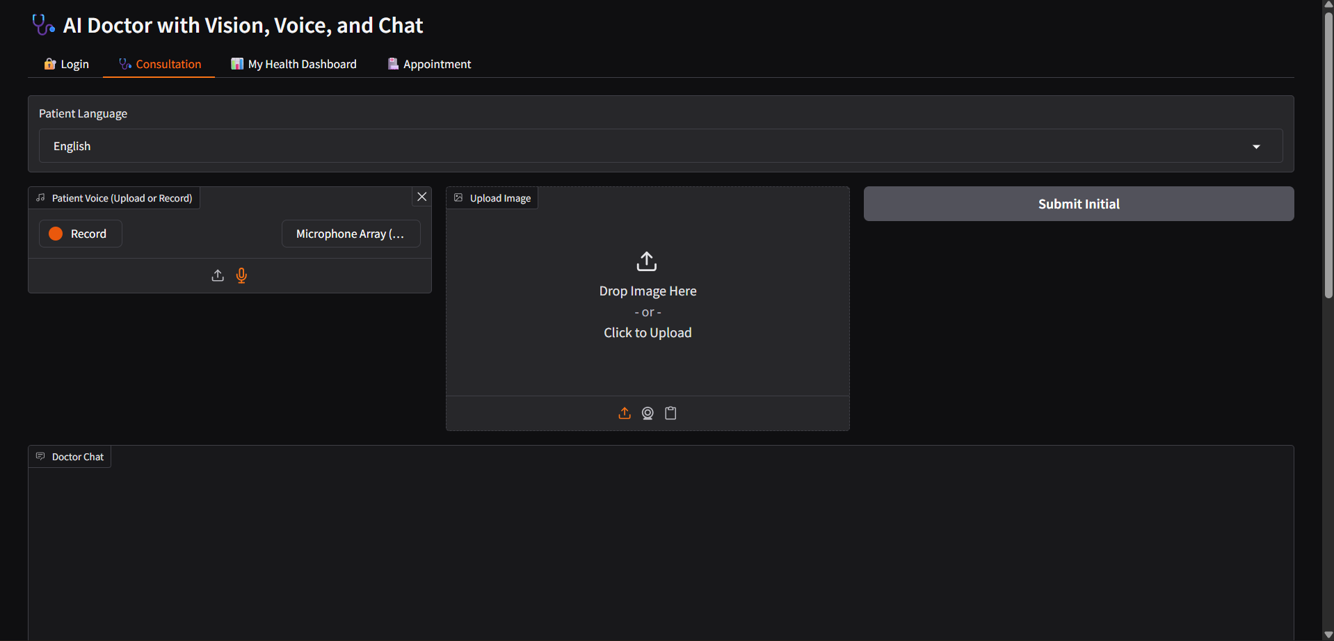 Voice-based symptom input where the patient interacts with the AI doctor using natural language.