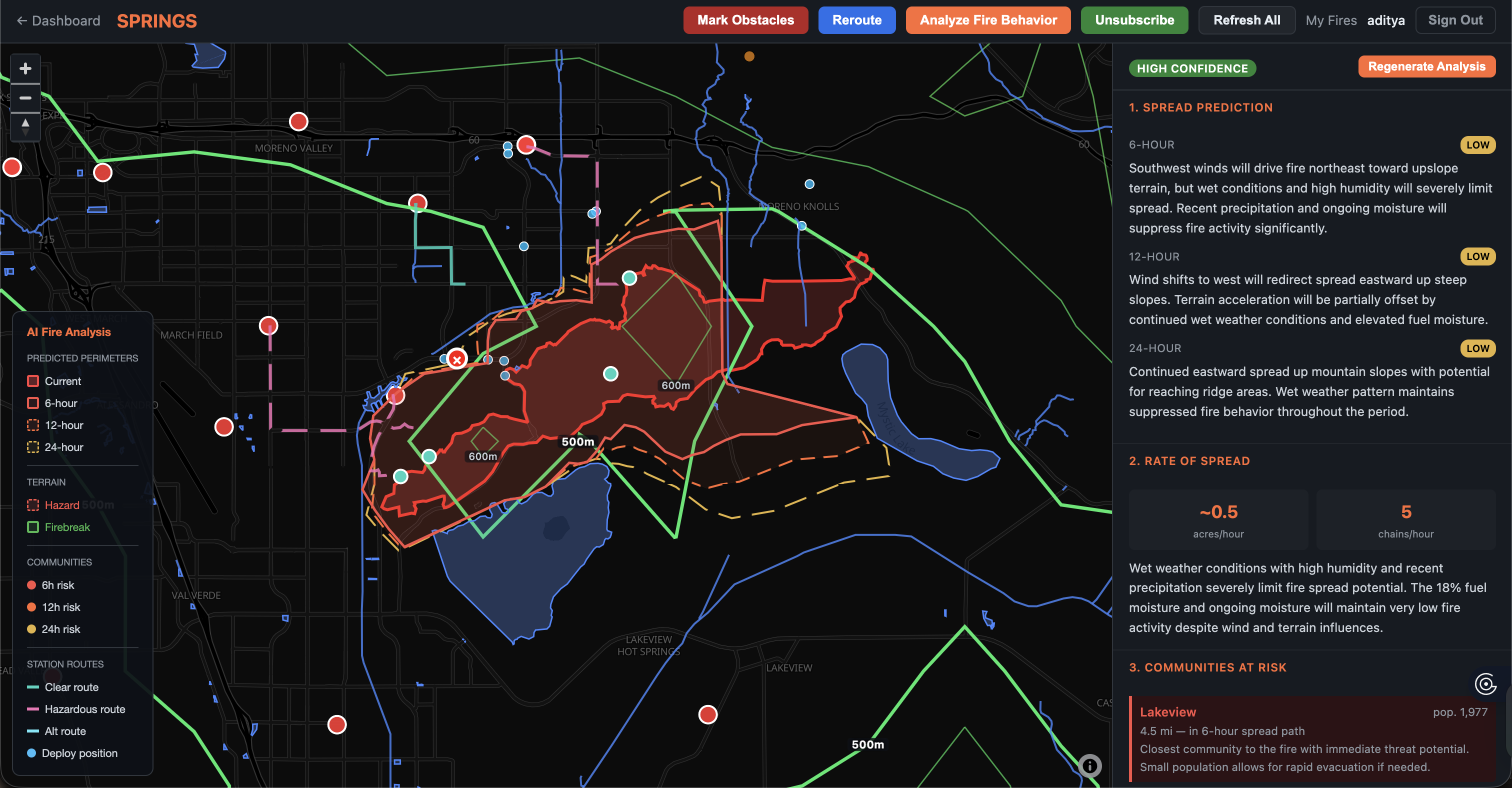 Real-time progressive rendering. Watching the analysis unfold on the map is genuinely compelling — station routes appear first, then predicted perimeters fade in at 6h/12h/24h, terrain hazards and firebreaks populate, communities at risk light up, and evacuation zones materialize. The SSE streaming makes the ~30-second analysis feel interactive rather than like a loading screen.