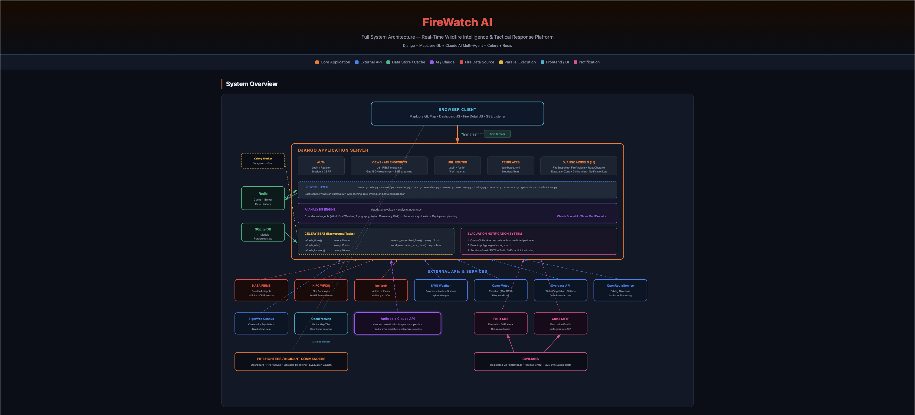 - Django serves as the application server with 35+ REST API endpoints handling everything from fire data aggregation to AI analysis orchestration