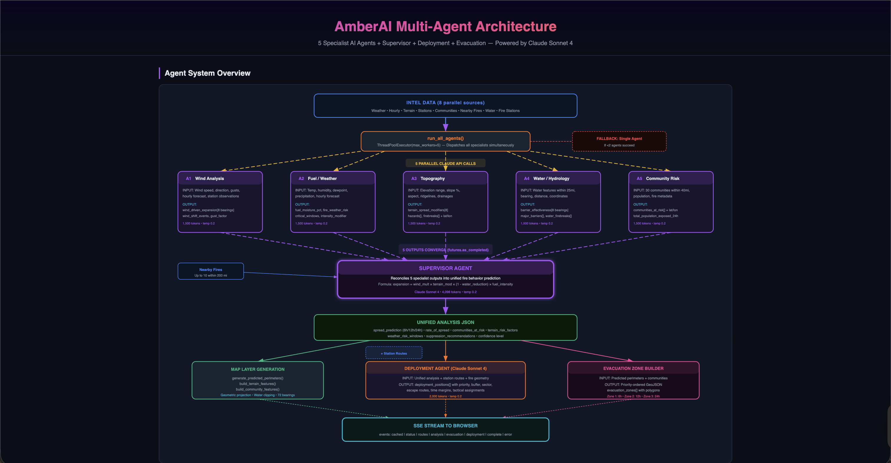 - ThreadPoolExecutor spawns 5 specialist agents simultaneously, each analyzing a different domain (wind, fuel, terrain, water, community risk), in total analyzing over a thousand geospatial data points.