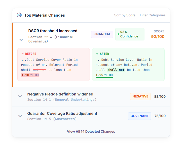 - Highlights what actually matters: covenant tightening, transfer restrictions, reporting frequency spikes