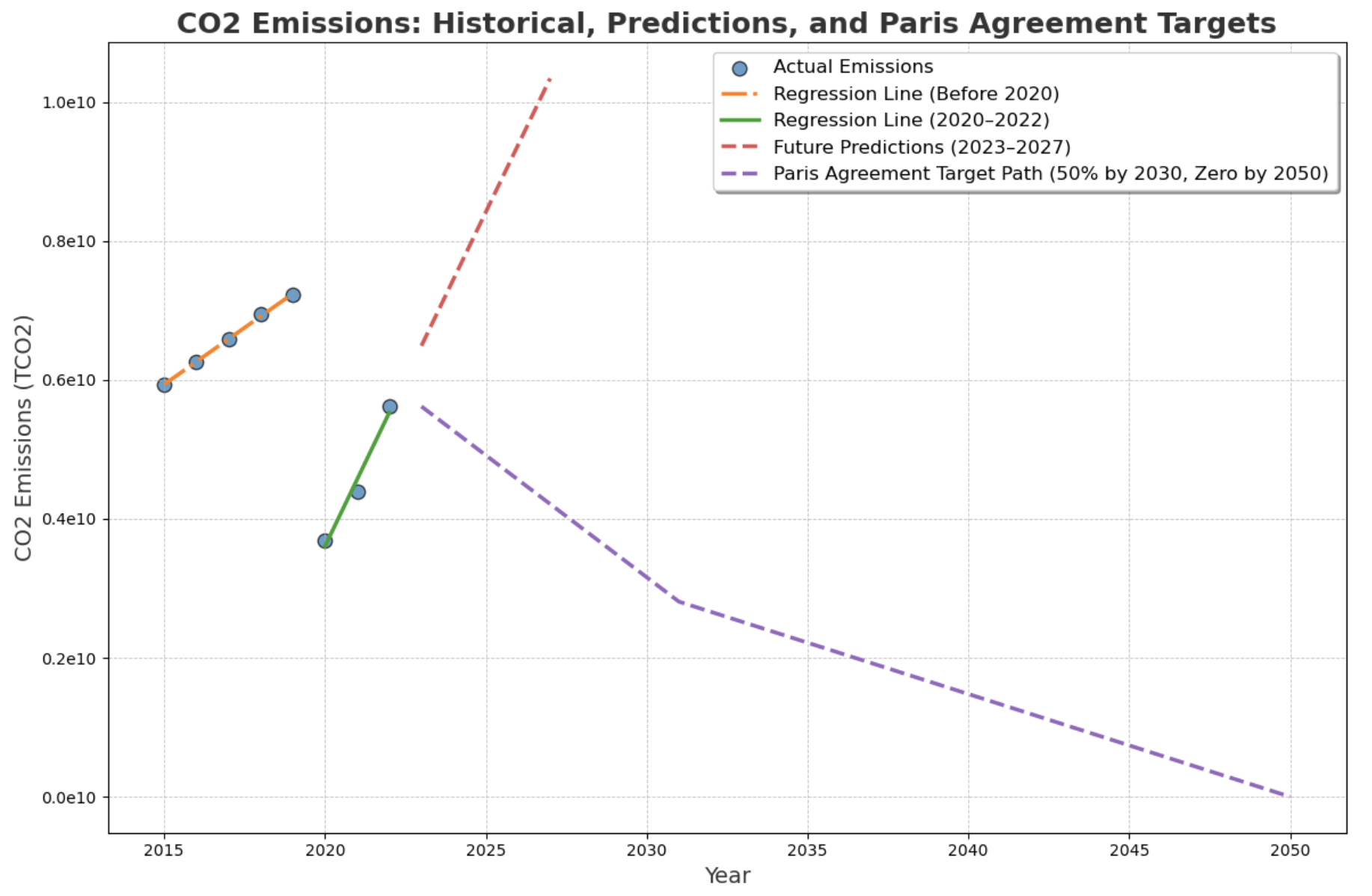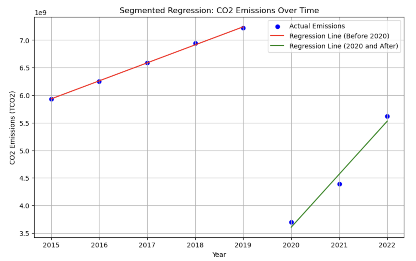 We deepened our understanding of data visualization techniques and learned how to make large datasets more digestible through interactive mapping. We also explored machine learning applications for environmental data, gaining valuable insights into predictive modeling. We learned that at the rate we're currently going, we won't be able to match The Paris Agreement's limit on global CO2 emissions link. Additionally, handling real-world data brought us new learnings on how to manage incomplete or inconsistent datasets.