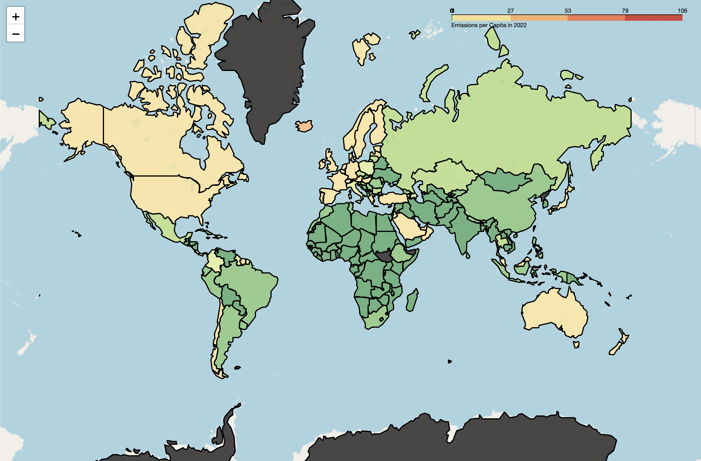 We collected emissions and population data from various open datasets, which were merged and analyzed using Python. We used Folium to build dynamic maps that display per capita emissions by country. The maps use a green-to-red gradient to represent emissions levels, making it visually intuitive. For predictive analysis, we trained a linear regression model to forecast future emissions trends, integrating this with the data visualization for a holistic view of global emissions. We also used an outside data set link in order to be able to create a variable known as EPC (emissions per capita) that let us visualize data while taking into account the population these countries have.