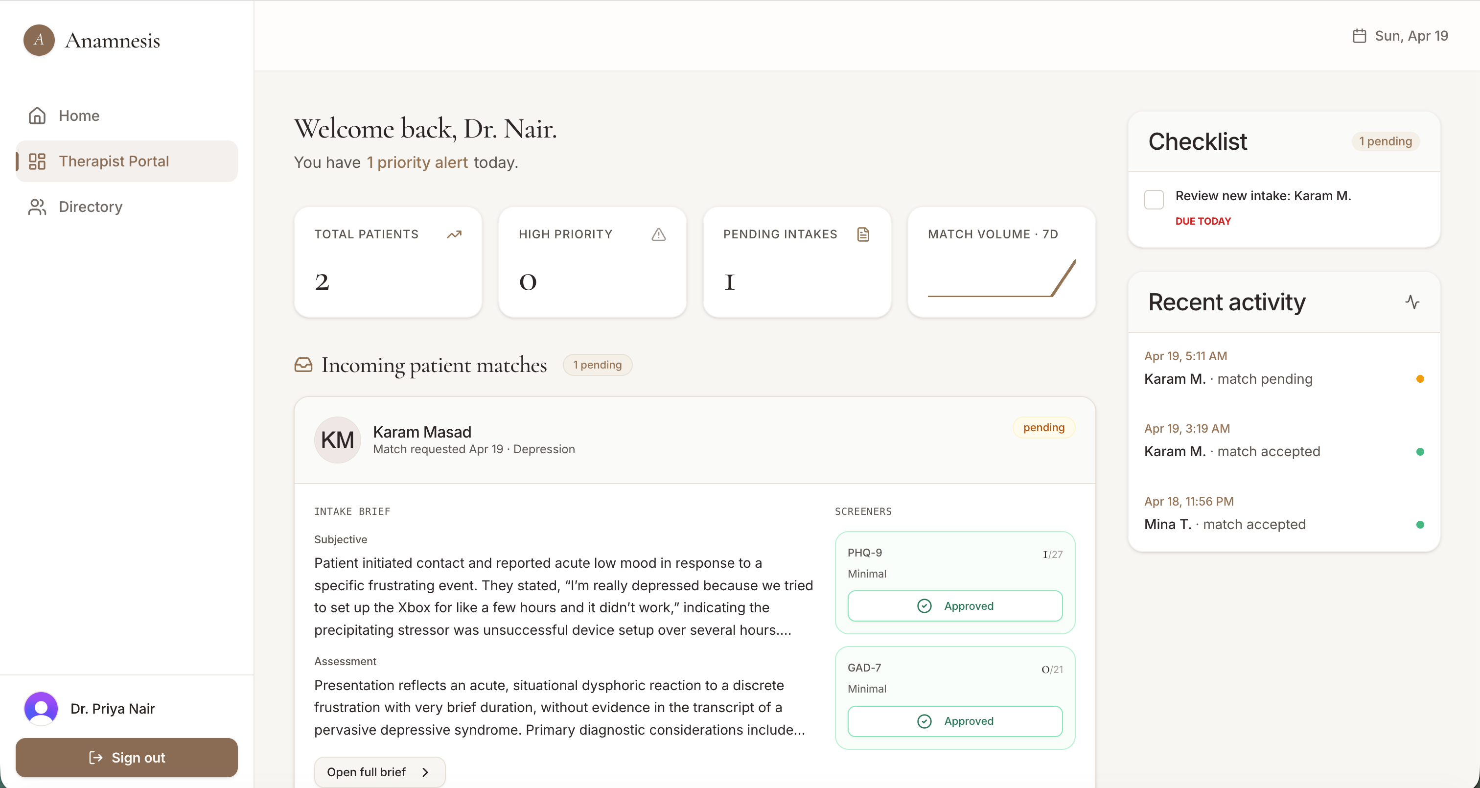 A real, end-to-end working product. Patient signs up, talks to AI, gets matched, and the therapist they choose has a brief waiting for them. Not a demo path. The whole loop.