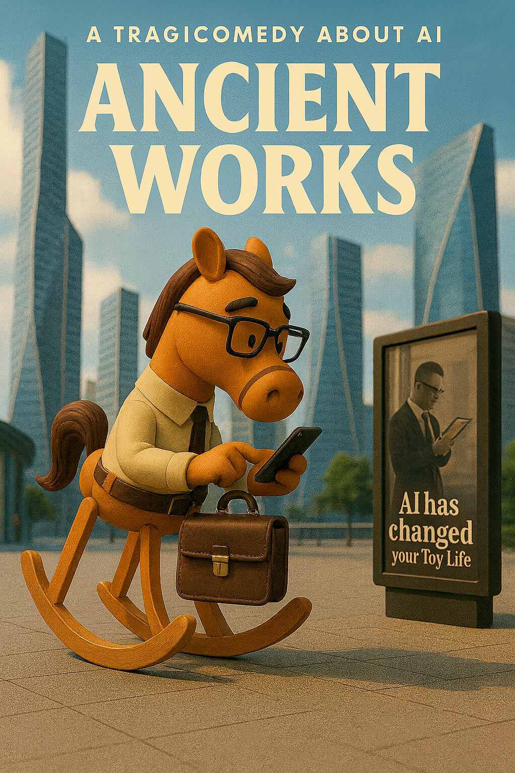 Ancient Work is a short film where a rocking horse struggles against a shape-shifting AI toy, exploring the clash between tradition, technology, and human identity.