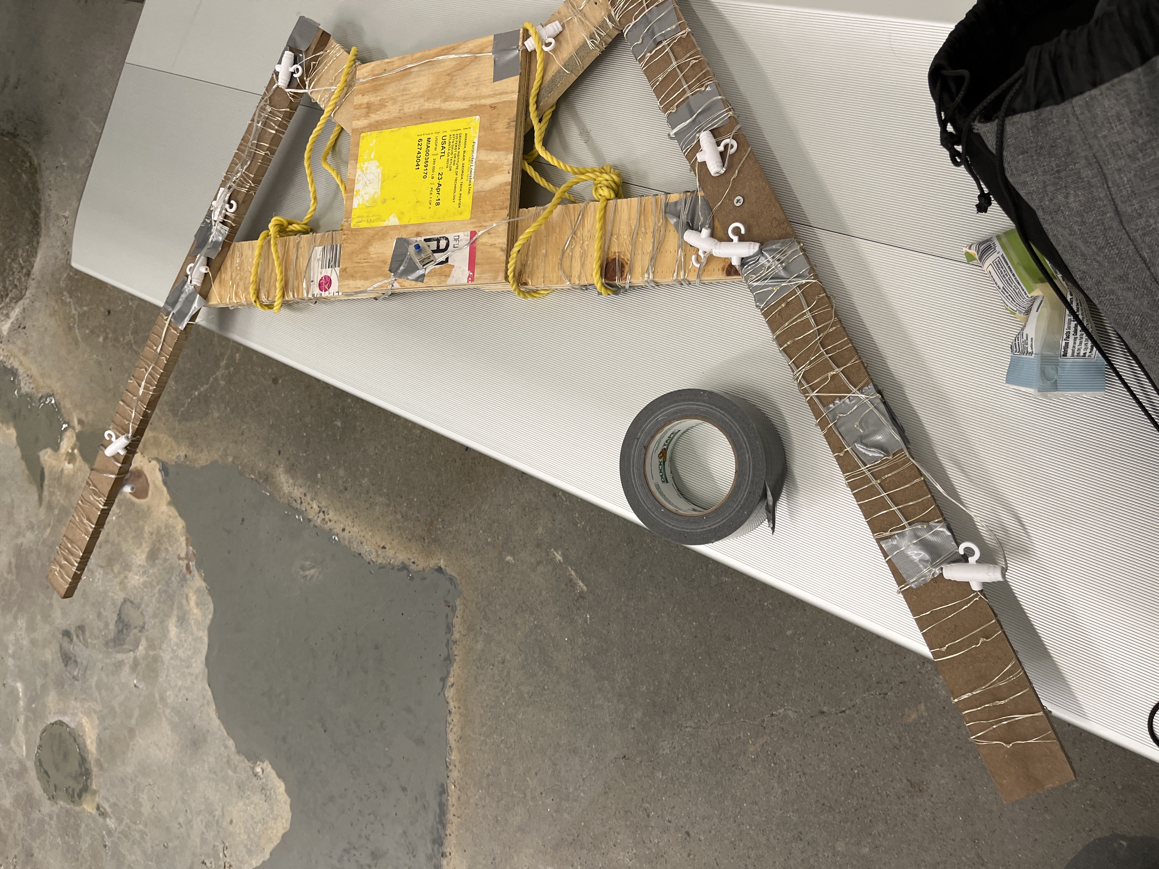 There was not enough scrap wood at the Hive so I went scavenging around the Invention Studio. Didn’t realize that the lights could be unrolled, so halfway through building I had to strip all the lights down then rewrap them around the frame.