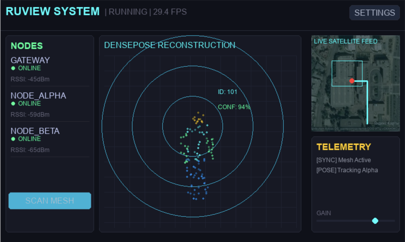 - DensePose-based person visualization ran on a heavy RunPod GPU streaming sensor data and presence visualization over WebSockets for fast remote inference