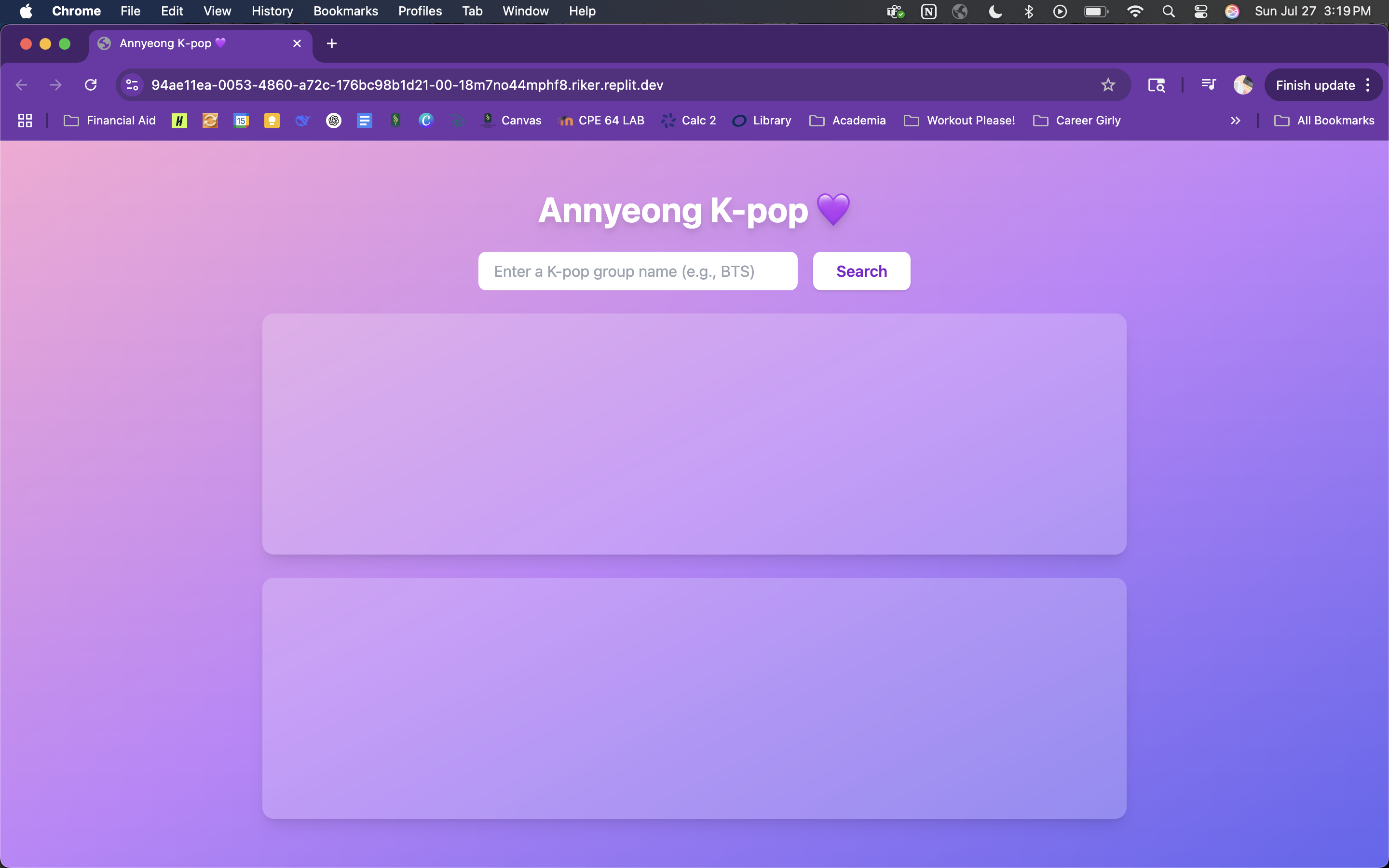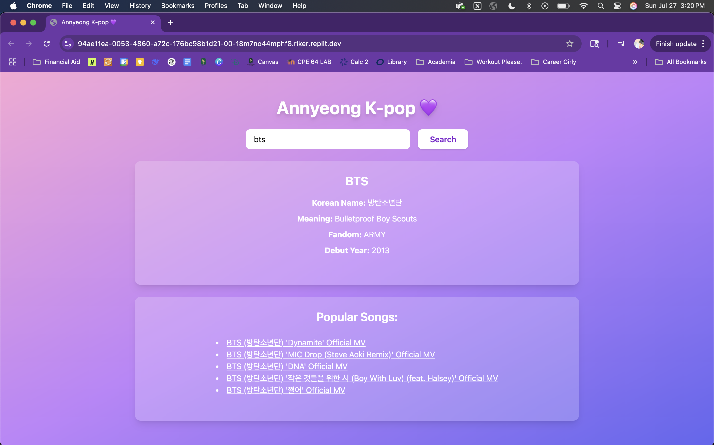 This project is essentially your one stop shop of information about any K-pop group you're interested in. Now, instead of having to do multiple searches and jumping between different sites all you have to do on Annyeong K-pop 💜 is type in the group's name and that is it! In an instance you'll get their Korean name, meaning behind their name, fandom name, and debut year, plus a list of their most popular and recent songs all in one place for you to explore!