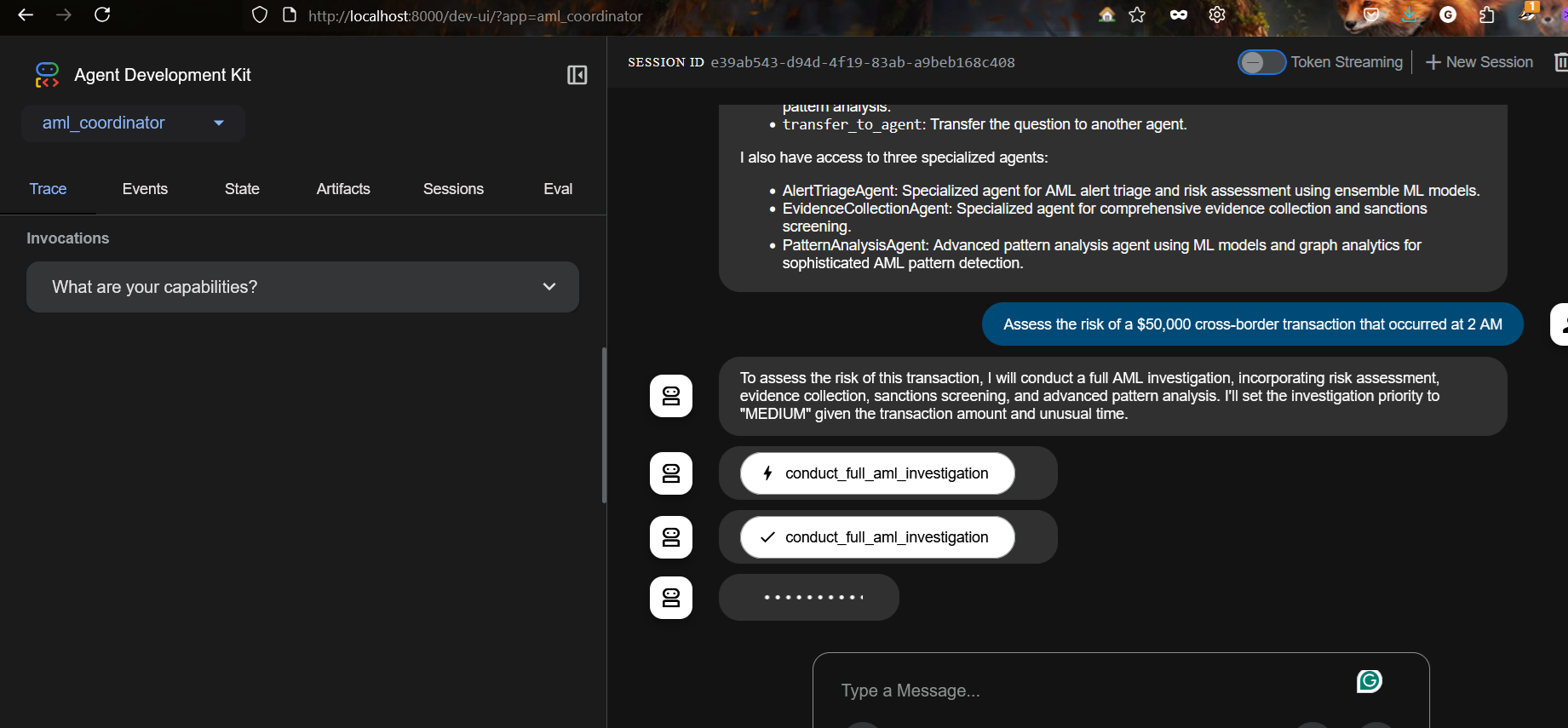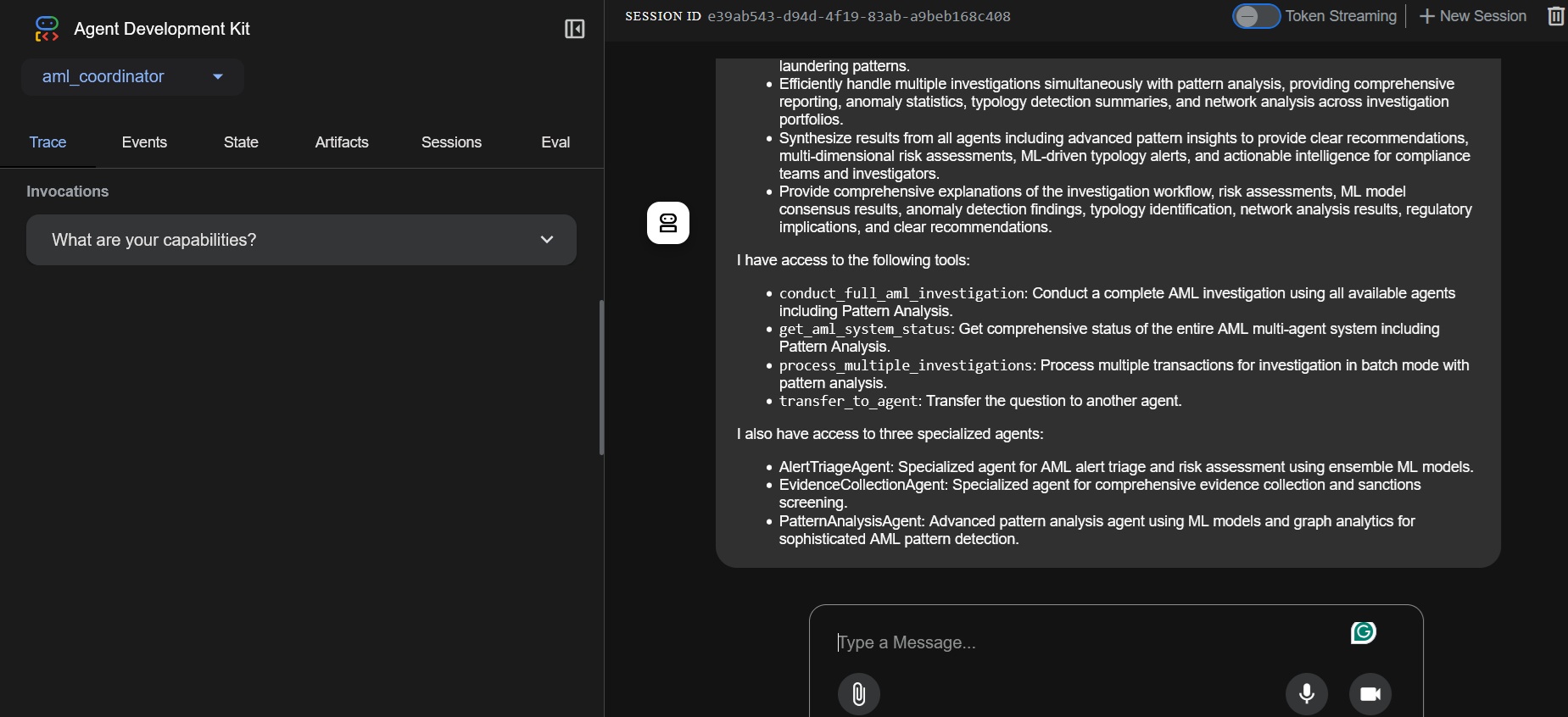 Data Engineering: Processed synthetic AML datasets with realistic ML patterns Model Training: Trained 12+ specialized ML models for different anomaly types Agent Development: Built 4 specialized agents with distinct capabilities System Integration: Created seamless multi-agent workflow coordination Validation: Tested against known ML typologies and regulatory requirements