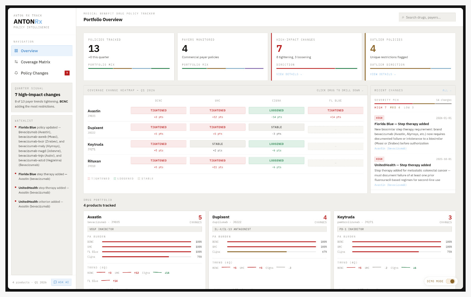 Diff engine: A structured diff runs against the prior version of every policy on ingestion, comparing field by field, detecting new indications, removed criteria, changed thresholds, and added step therapy requirements, then logging each change with a HIGH/MED/LOW severity score. The change digest feed is the homepage of the frontend; every entry includes the specific field that changed, the before and after values, and a link to the source document.
