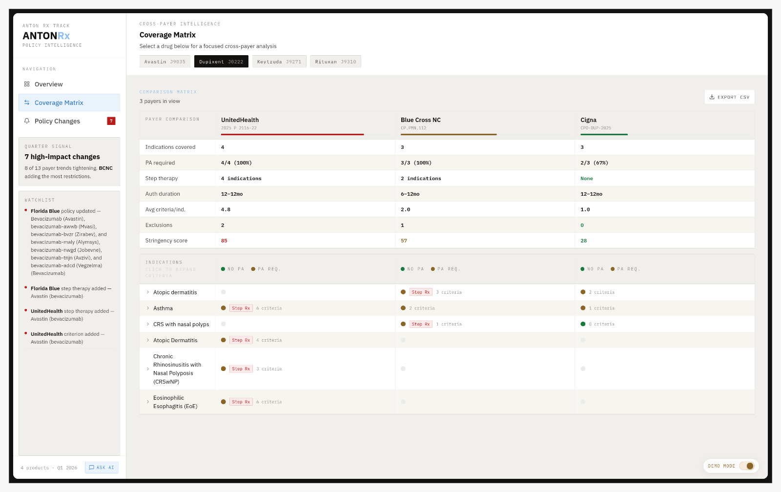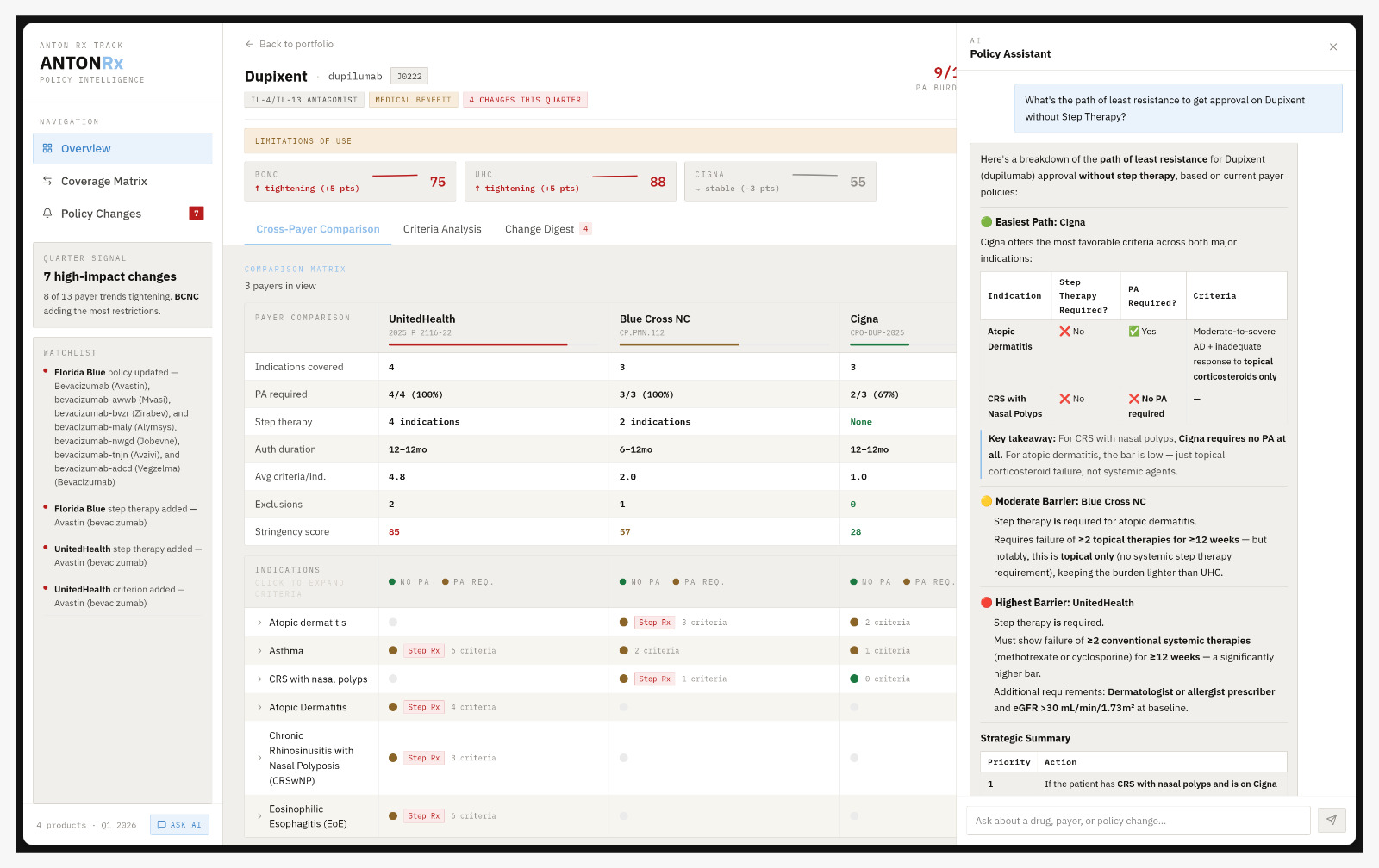 AntonIQ is an AI-powered medical policy intelligence platform. It ingests PDF and DOCX policy documents from any payer and extracts structured coverage data, including indications, prior authorization criteria, step therapy requirements, HCPCS codes, and effective dates. It then normalizes everything into a single comparable format.