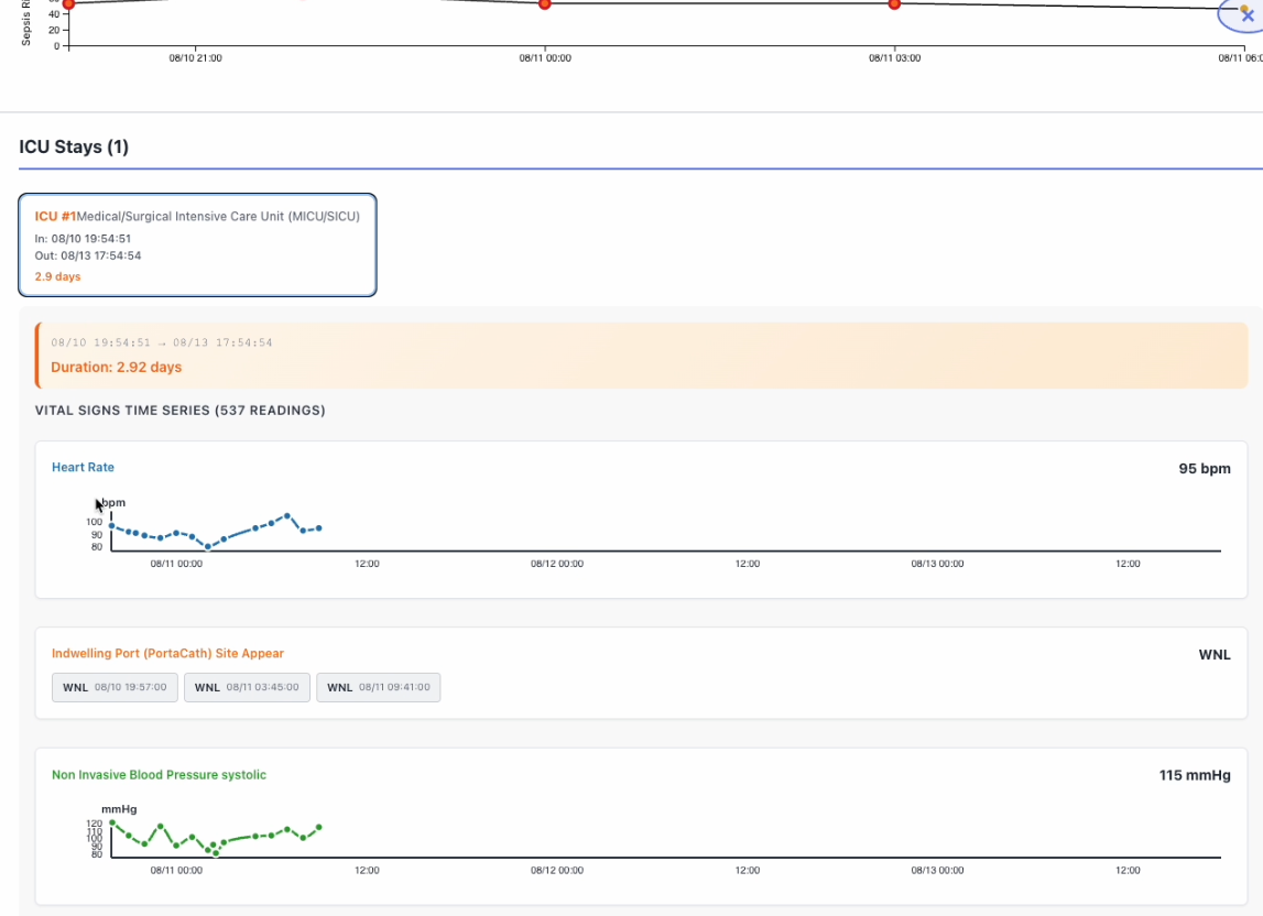 - Calculates SOFA scores (Sequential Organ Failure Assessment) in real-time from vital signs