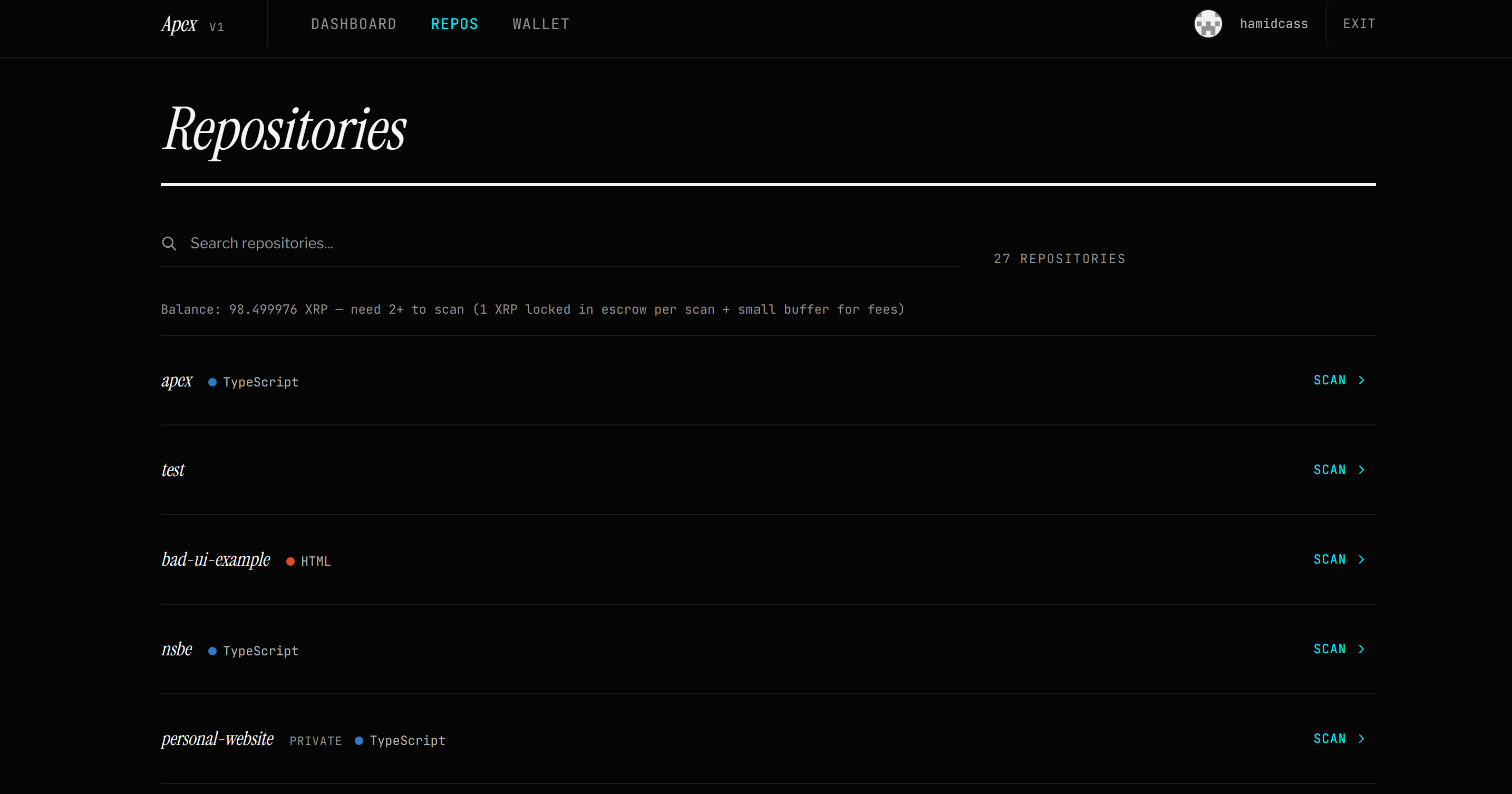 If the scan completes successfully, the escrow is released. If the scan fails, for example because the repository does not have a runnable frontend, the user can cancel the escrow and get their XRP back.