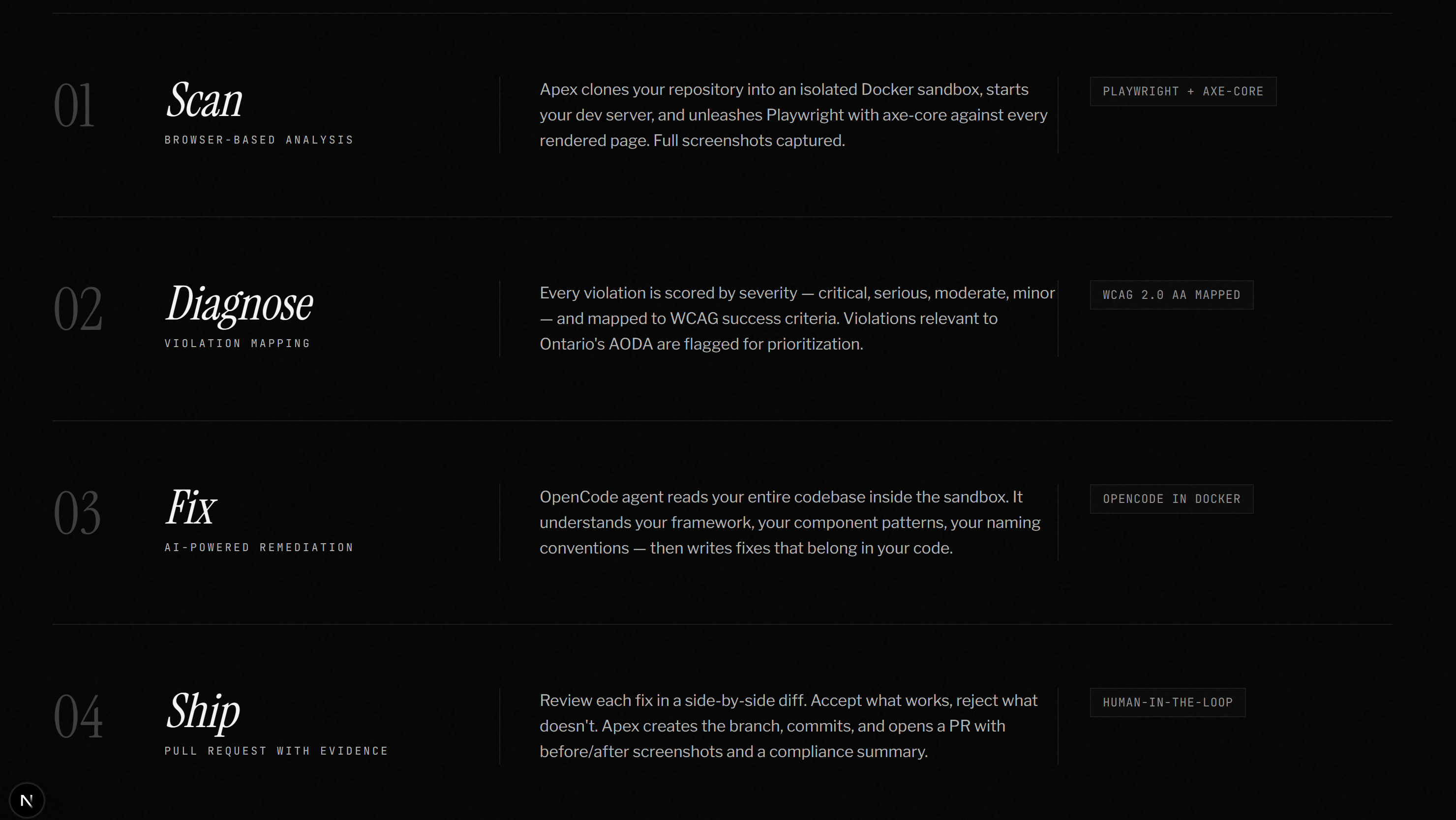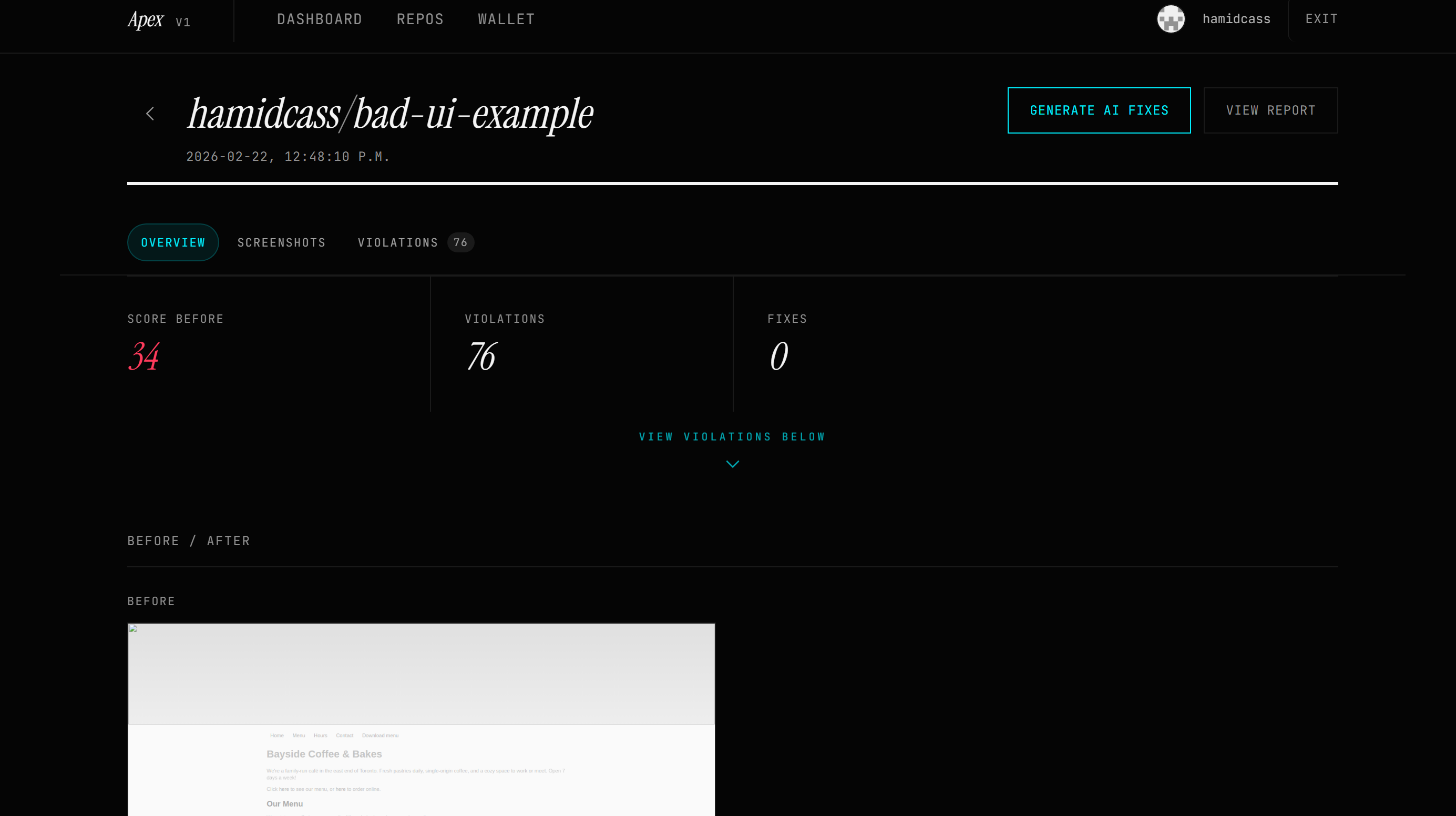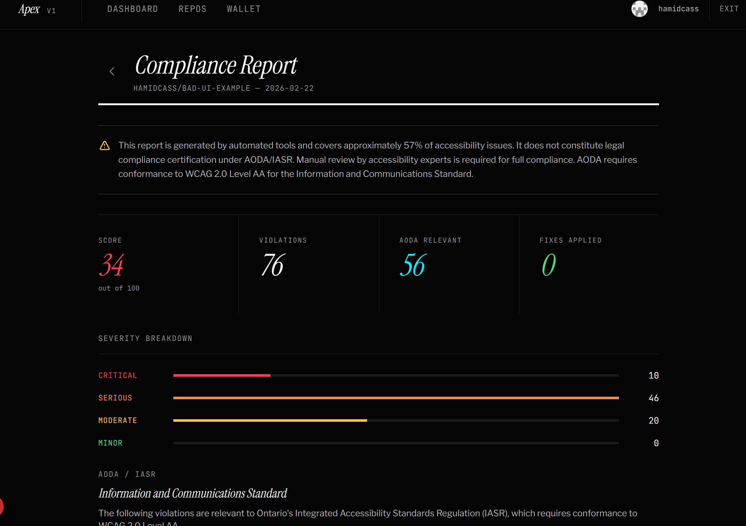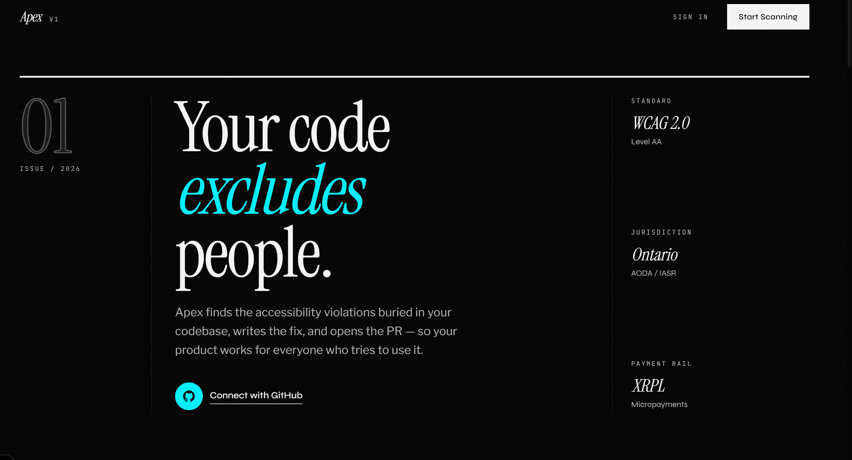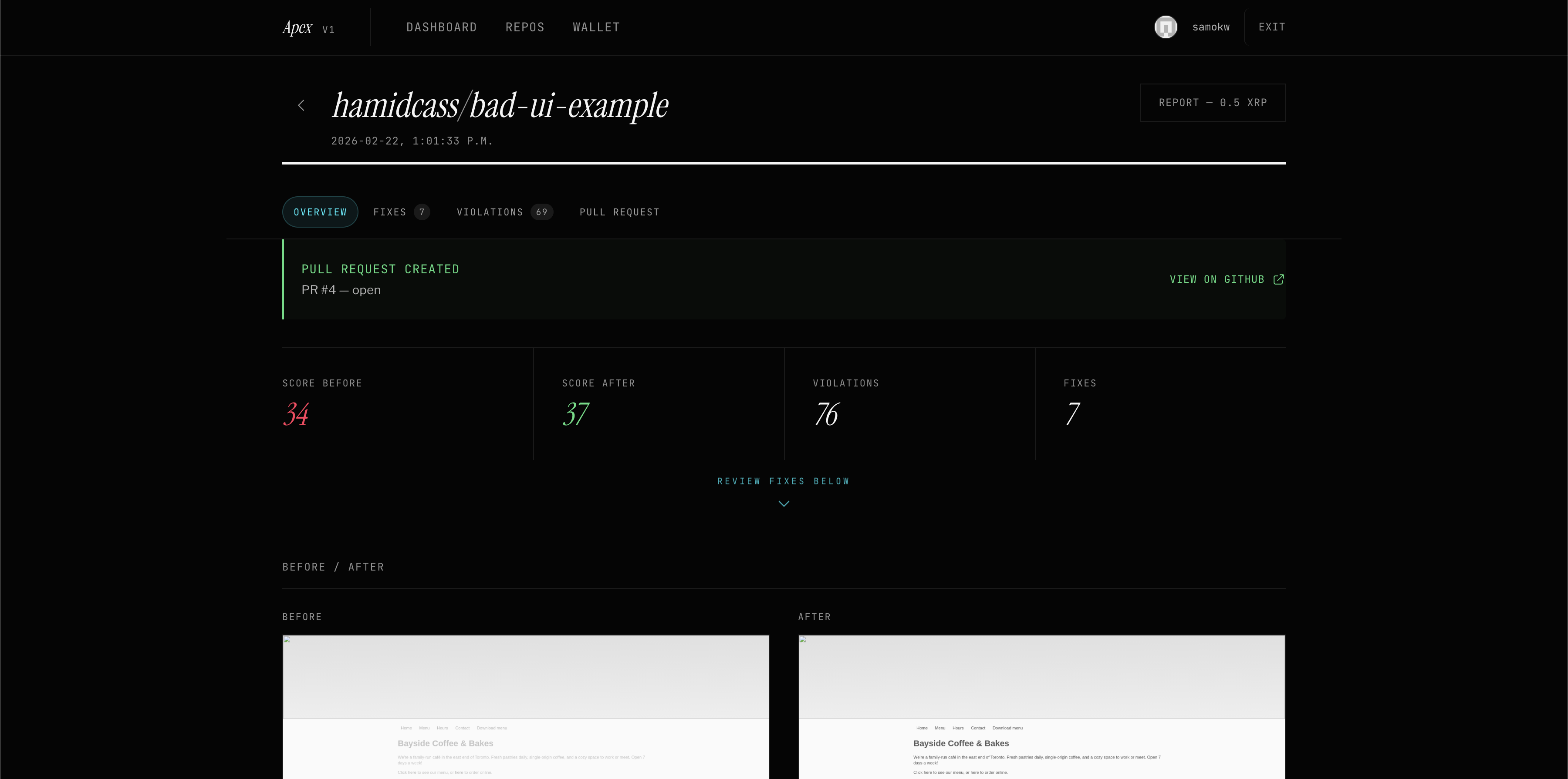 Users connect their GitHub repository and lock 1 XRP in escrow. Apex clones the repository, runs an automated accessibility audit with Playwright and axe-core, and generates a detailed report.