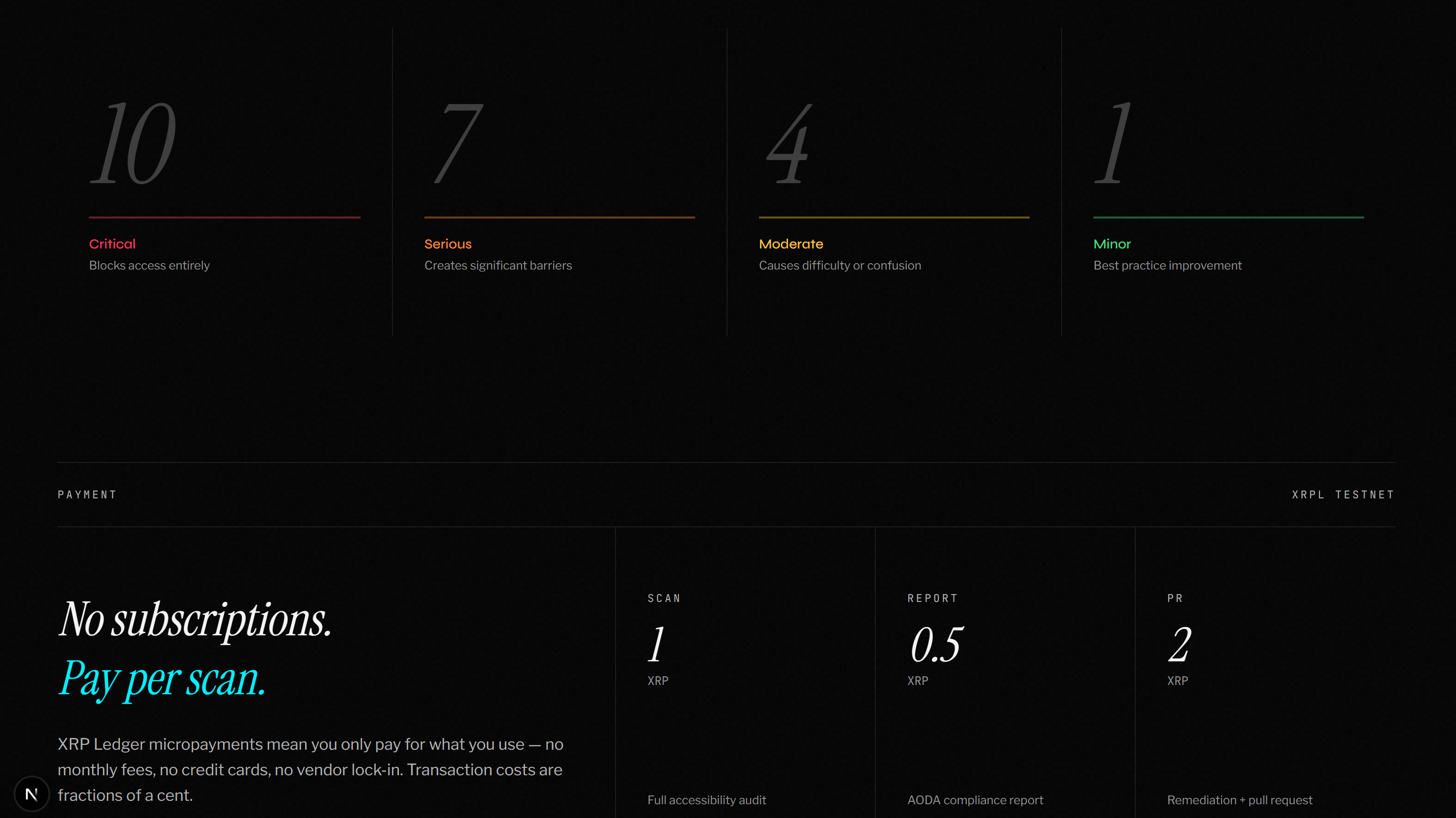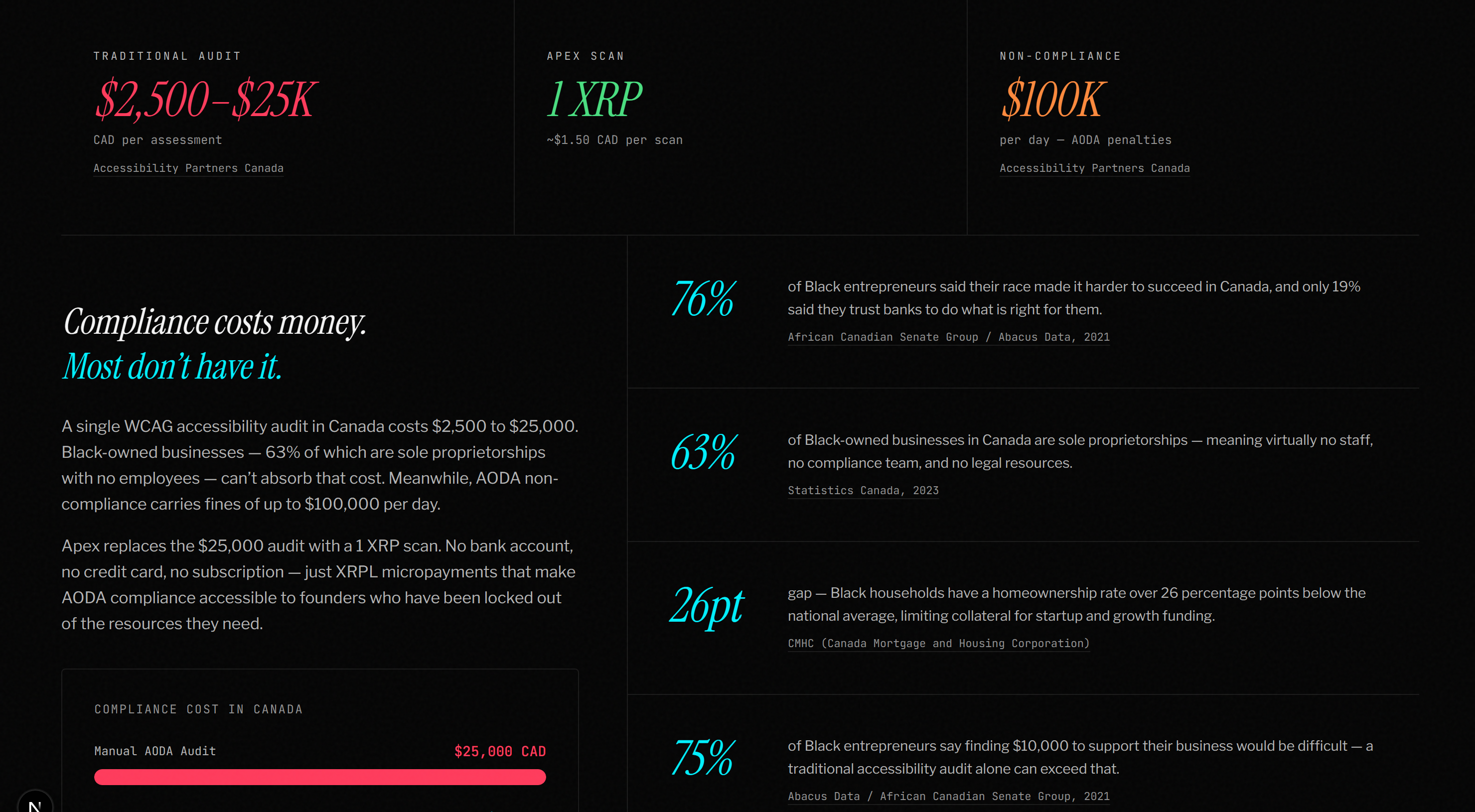 Apex is an accessibility scanner that uses XRPL escrow for outcome-based payments.