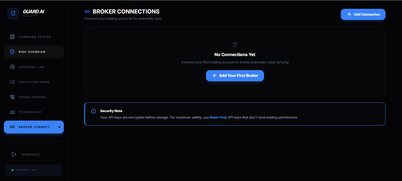 Global Scaling & Accessibility We aim to take Guard AI global, bridging the gap for traders in emerging markets like Nigeria. By integrating more local and international brokers through an expanded Universal Connect API, we want to ensure that any trader, anywhere in the world, has a digital supervisor protecting their capital from the "human element."