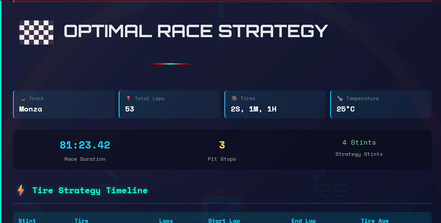 Balancing realism with computational speed was the biggest challenge. Race strategy is chaotic, time-sensitive, and uncertain. Designing models that were accurate yet fast enough for real-time decision-making required careful trade-offs, experimentation, and iteration.