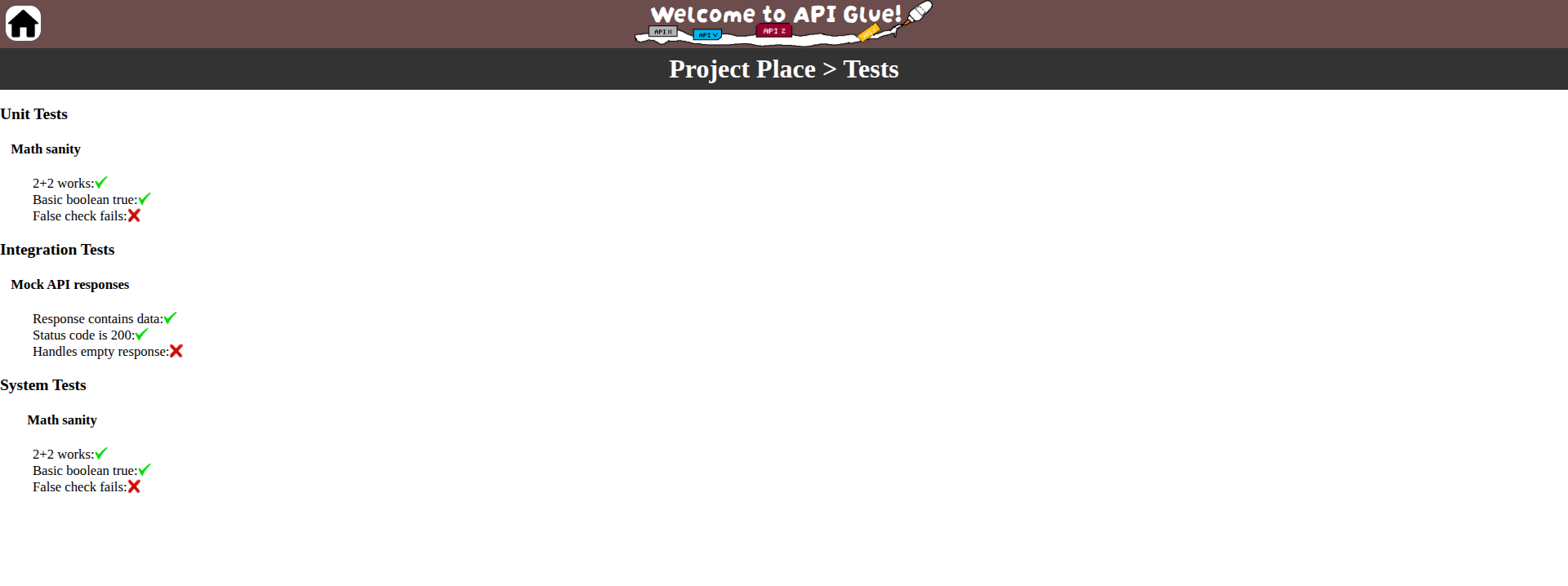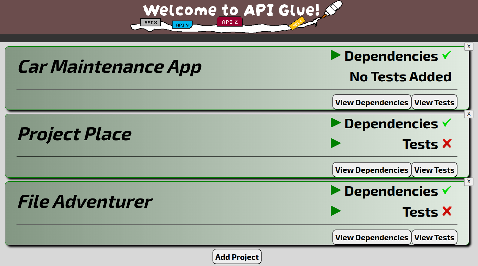APIGlue allows you to add your "projects" and view if all the dependencies are up and running. You can add dependencies by heading into "View Dependencies", adding a title for a dependency, and then modifying a sample function to make a request to the API. You can customize what is considered "passing", as well as the response value! Additionally, you can link files with test cases and check if your project not only passes for its external dependencies, but internal dependencies as well! Meaning that APIGlue doubles as a testing framework that shows you if your local tests passed or failed.