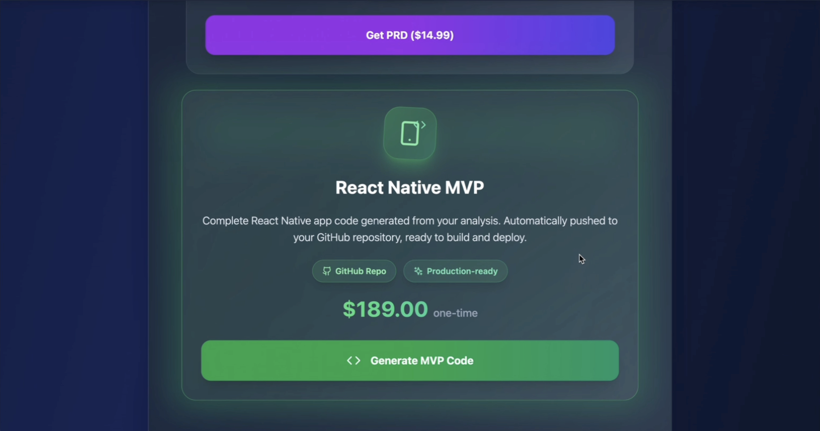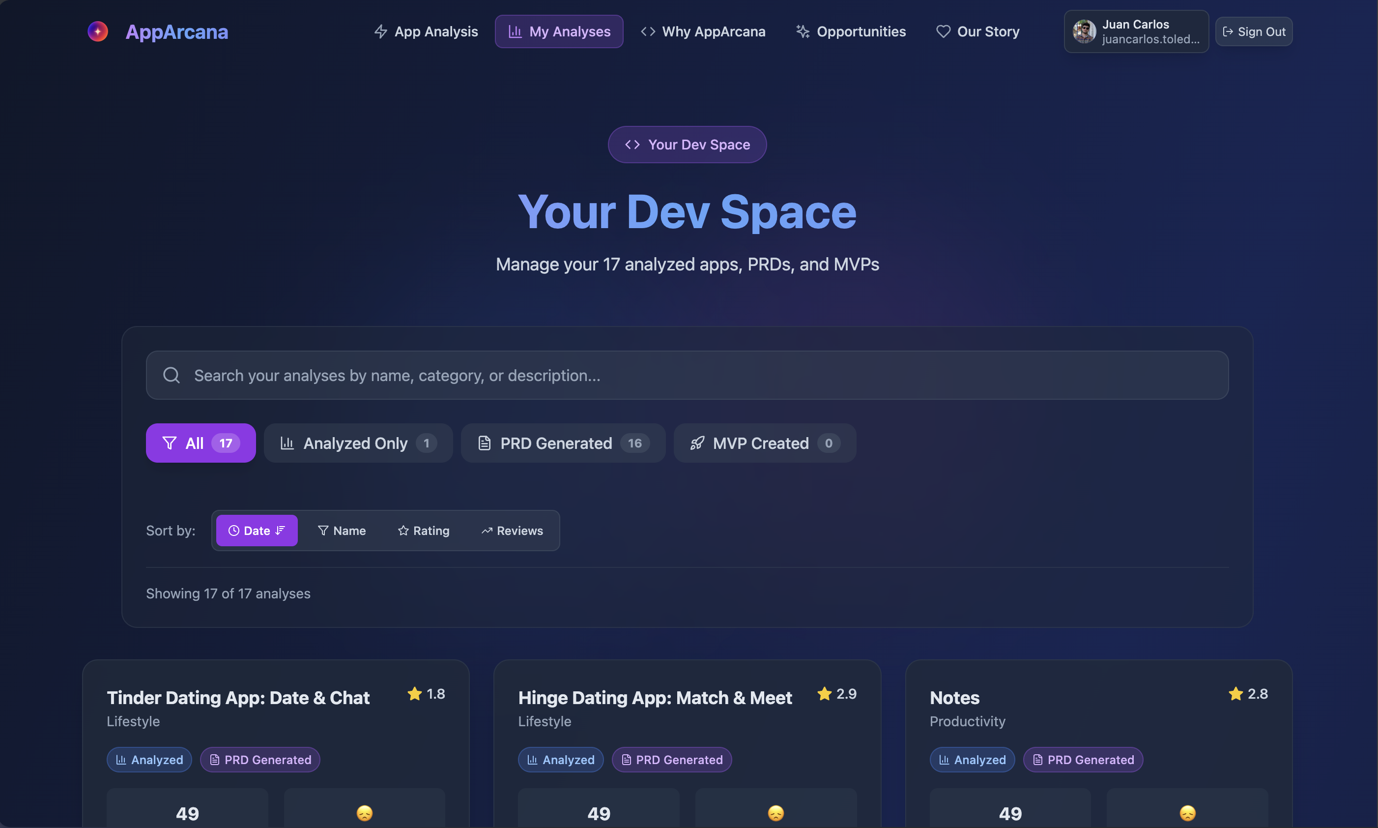 This is where all your analyzed apps live. From here, you can download PRDs, export insights, or generate MVP code into your GitHub repo.