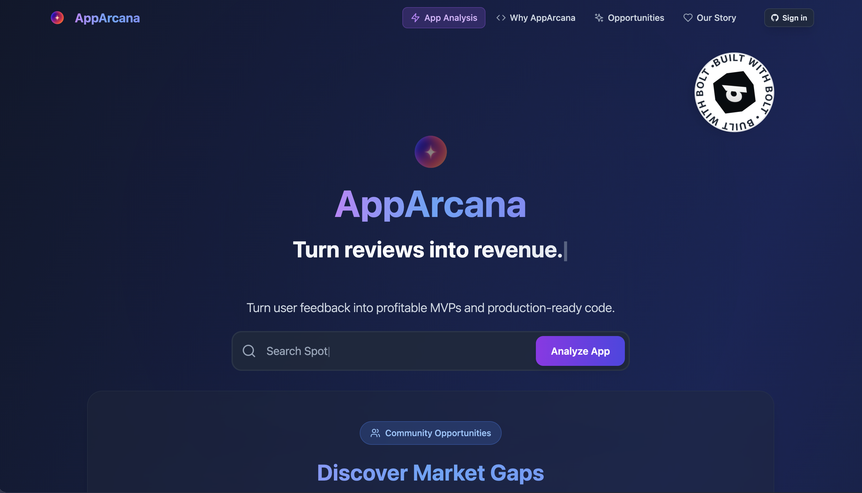 AppArcana takes poorly rated but widely downloaded apps and turns them into goldmines of insight. It analyzes reviews, surfaces patterns, and gives you two powerful things: • A full Product Requirements Document based on real user pain • A working MVP codebase you can drop straight into your GitHub repo