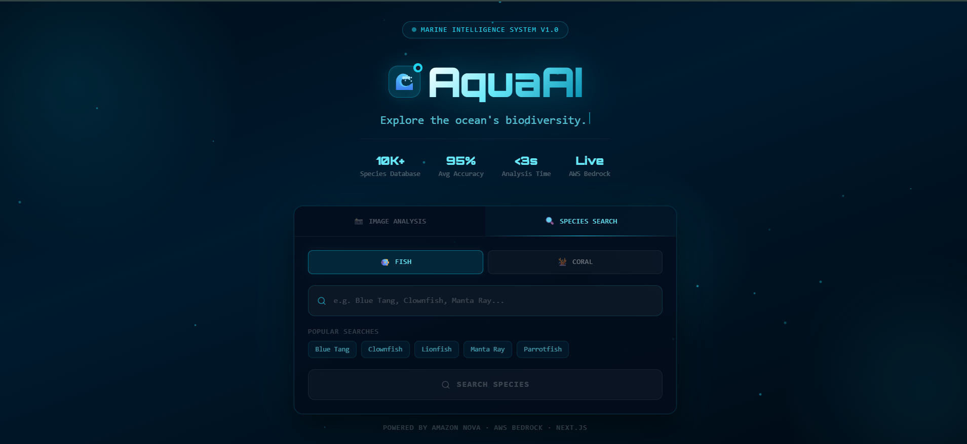 AquaAI home page — marine species identification and coral reef health monitoring platform powered by Amazon Nova on AWS Bedrock
