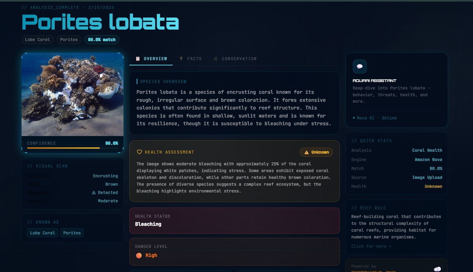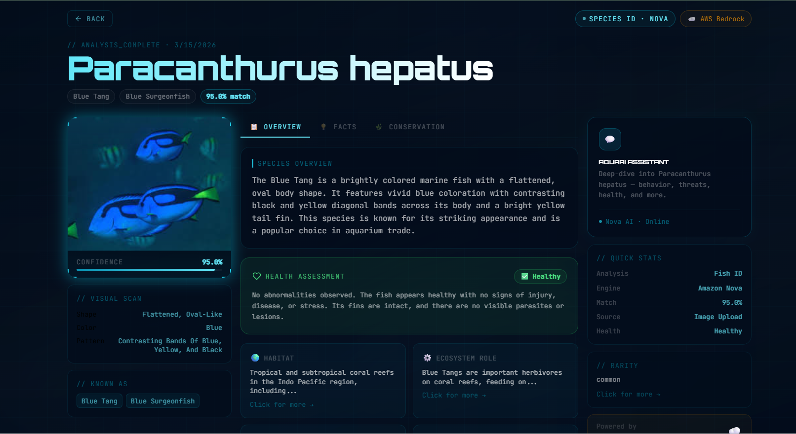 1. Marine Species Identification Upload any photo of a fish, coral, or marine creature and get instant species identification with confidence scoring, ecological profile, habitat info, and interesting facts powered by Amazon Nova's multimodal vision.