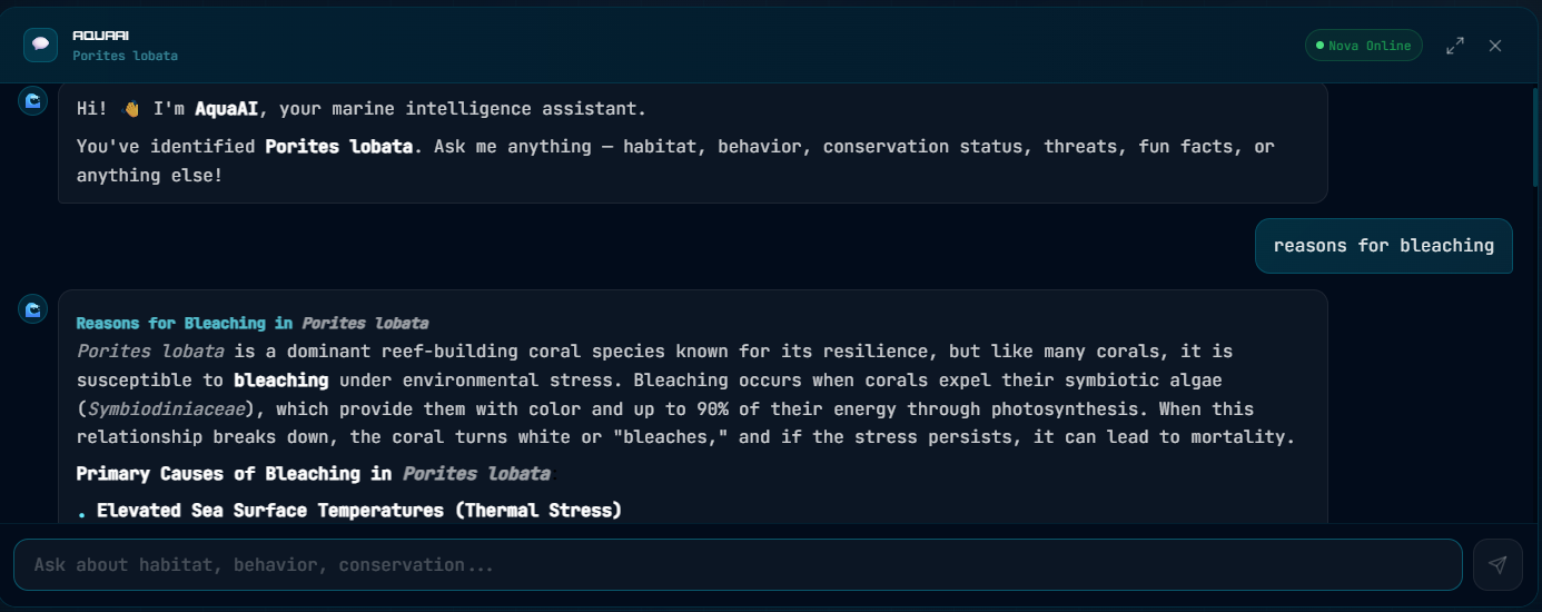 I wanted to build something that puts the power of marine science in everyone's hands. Whether you're a reef conservationist, a marine biology student, a scuba diver, or just someone who found a strange creature on the beach AquaAI gives you instant, expert-level identification and health assessment powered by AI.
