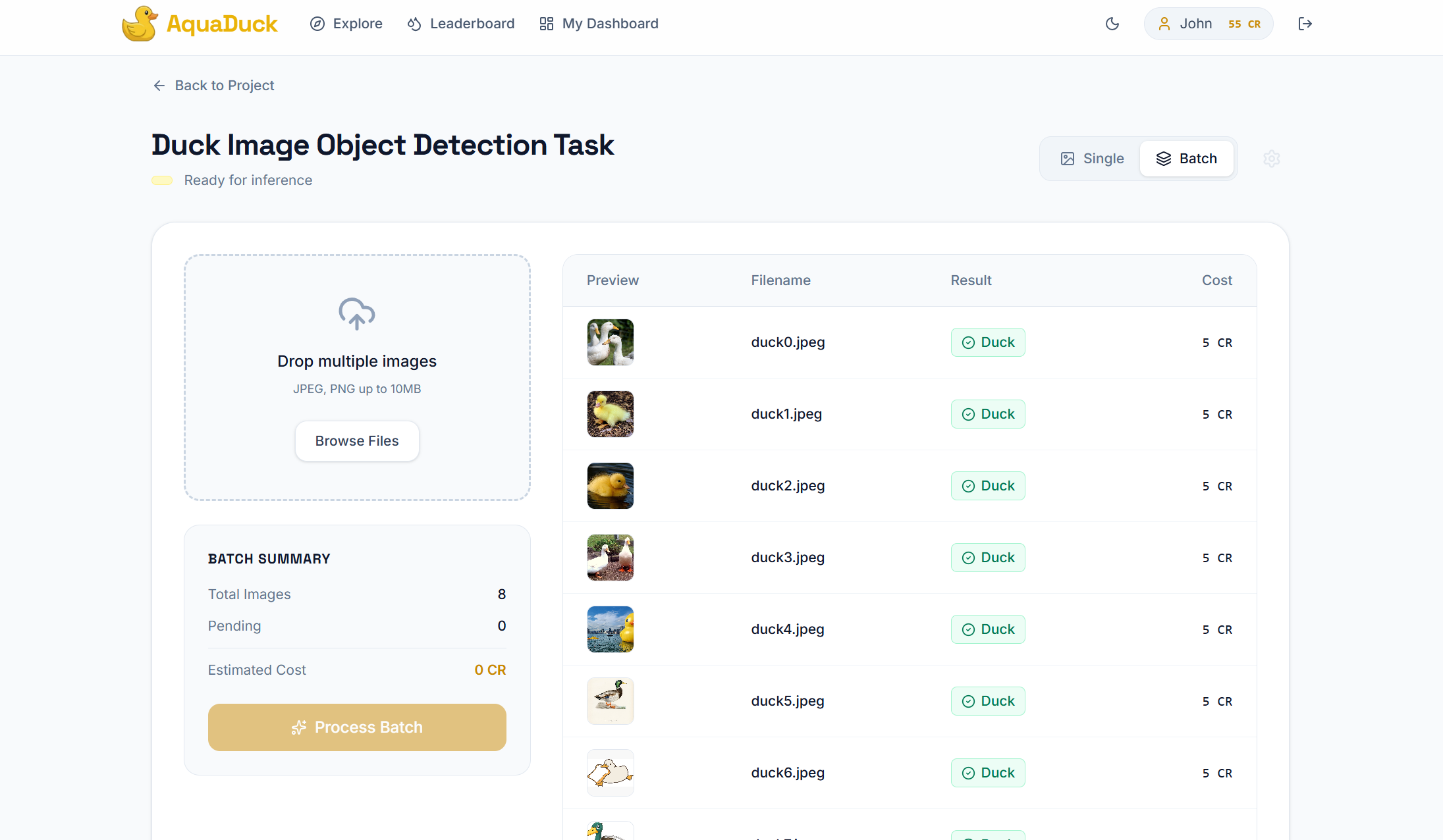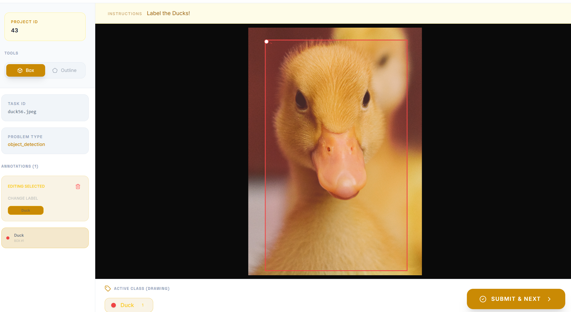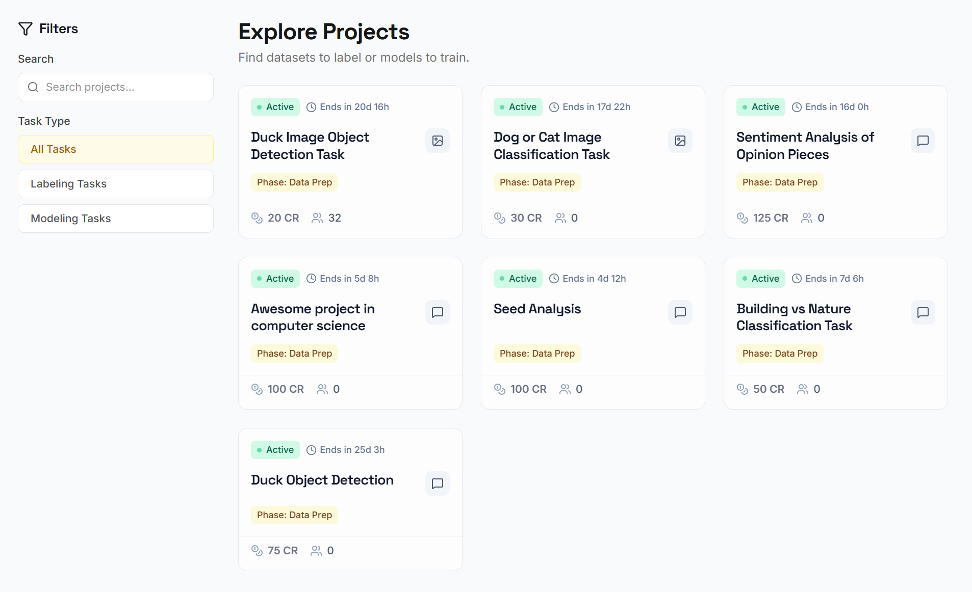 AquaDuck opens an entire machine learning pipeline to the world. From labeling data to training and hosting models, we provide a complete process for companies (clients) in need of additional expertise. This is done through a competitive pipeline where businesses post ML tasks for anyone to tackle. This allows clients to outsource the technically challenging aspects of integrating AI while still getting the best value for their money.