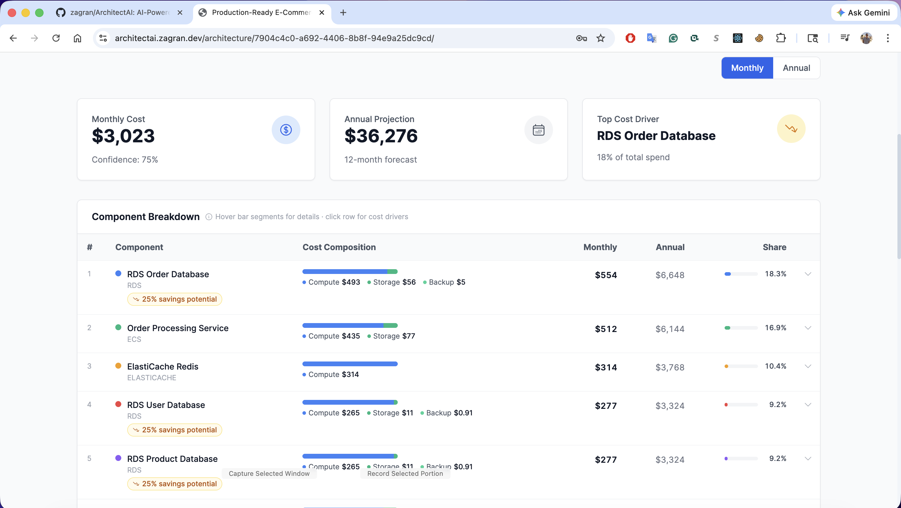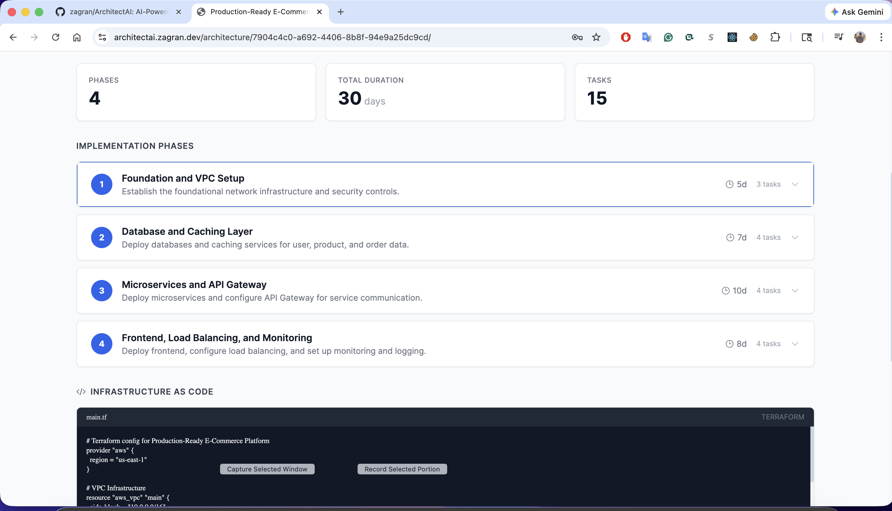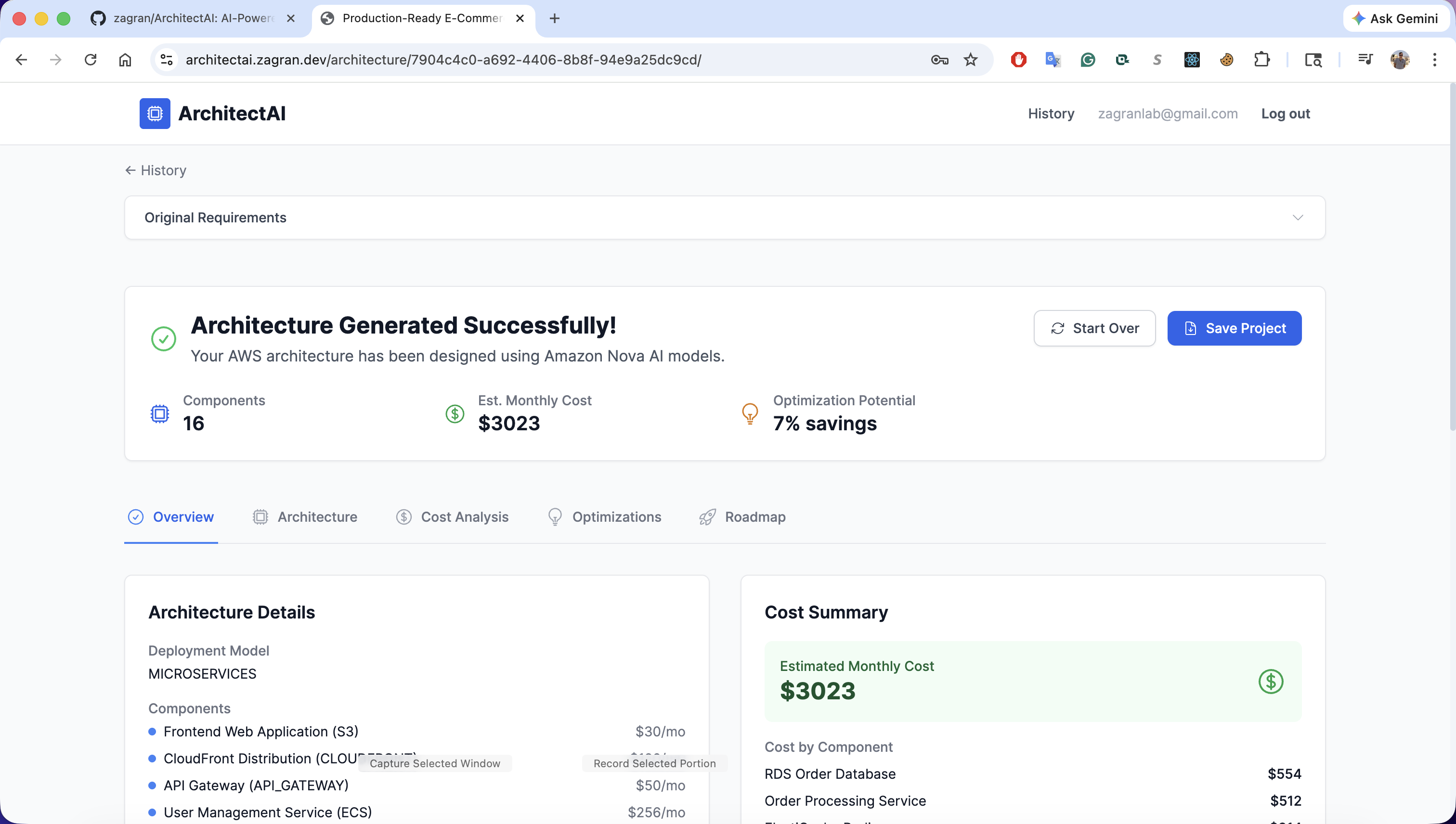 - End-to-end in ~30 seconds - plain English input to full architecture with diagram, cost analysis, optimizations, and a multi-phase roadmap