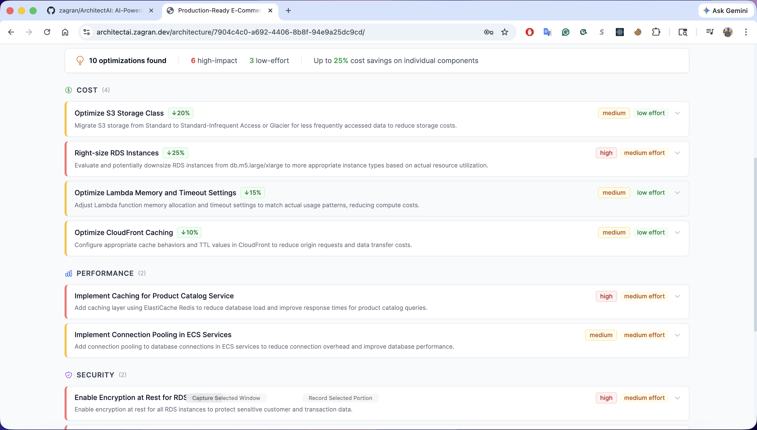 - Optimization suggestions - categorized by Cost / Performance / Security, ranked by impact and effort, with step-by-step implementation guidance