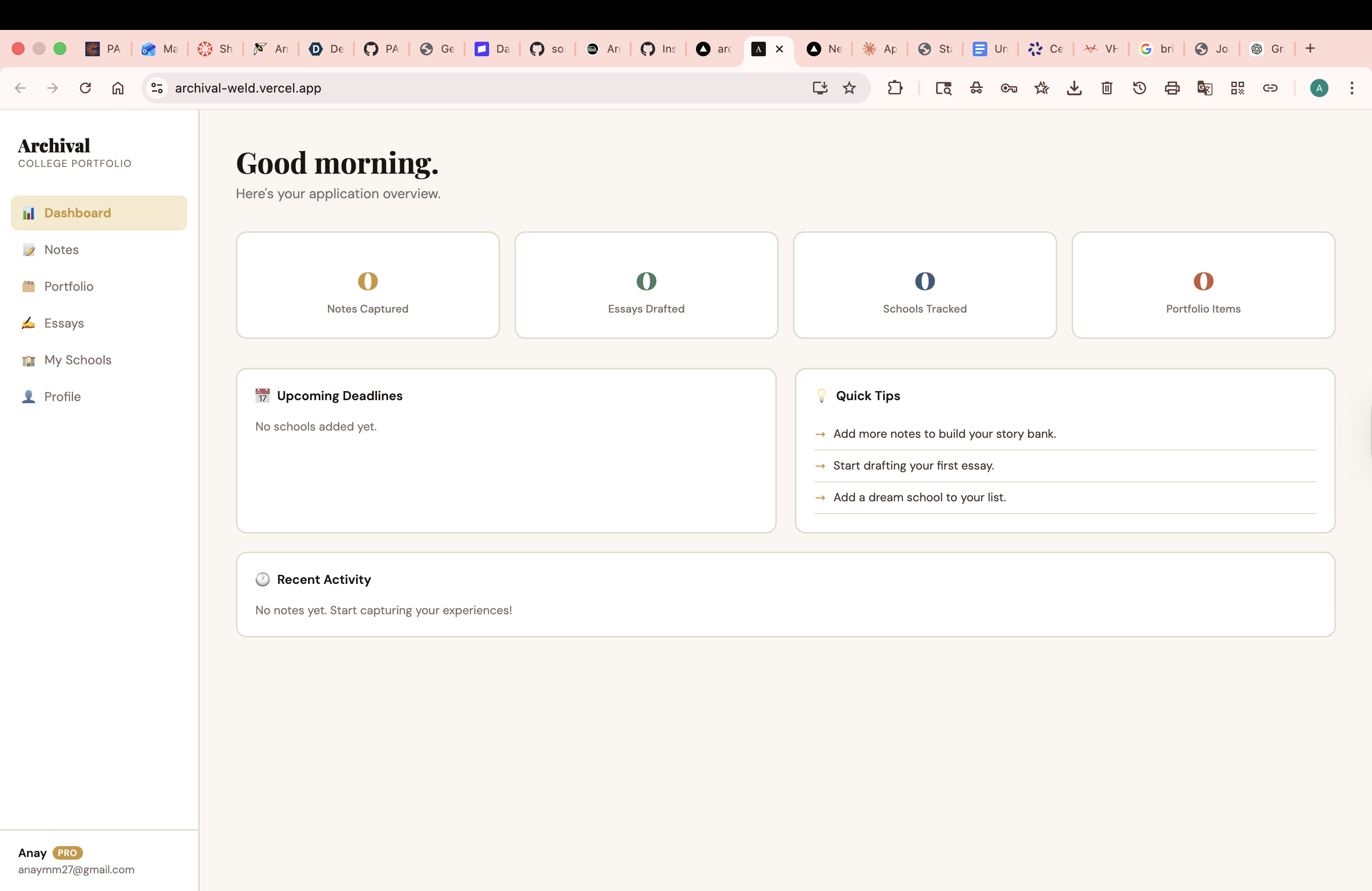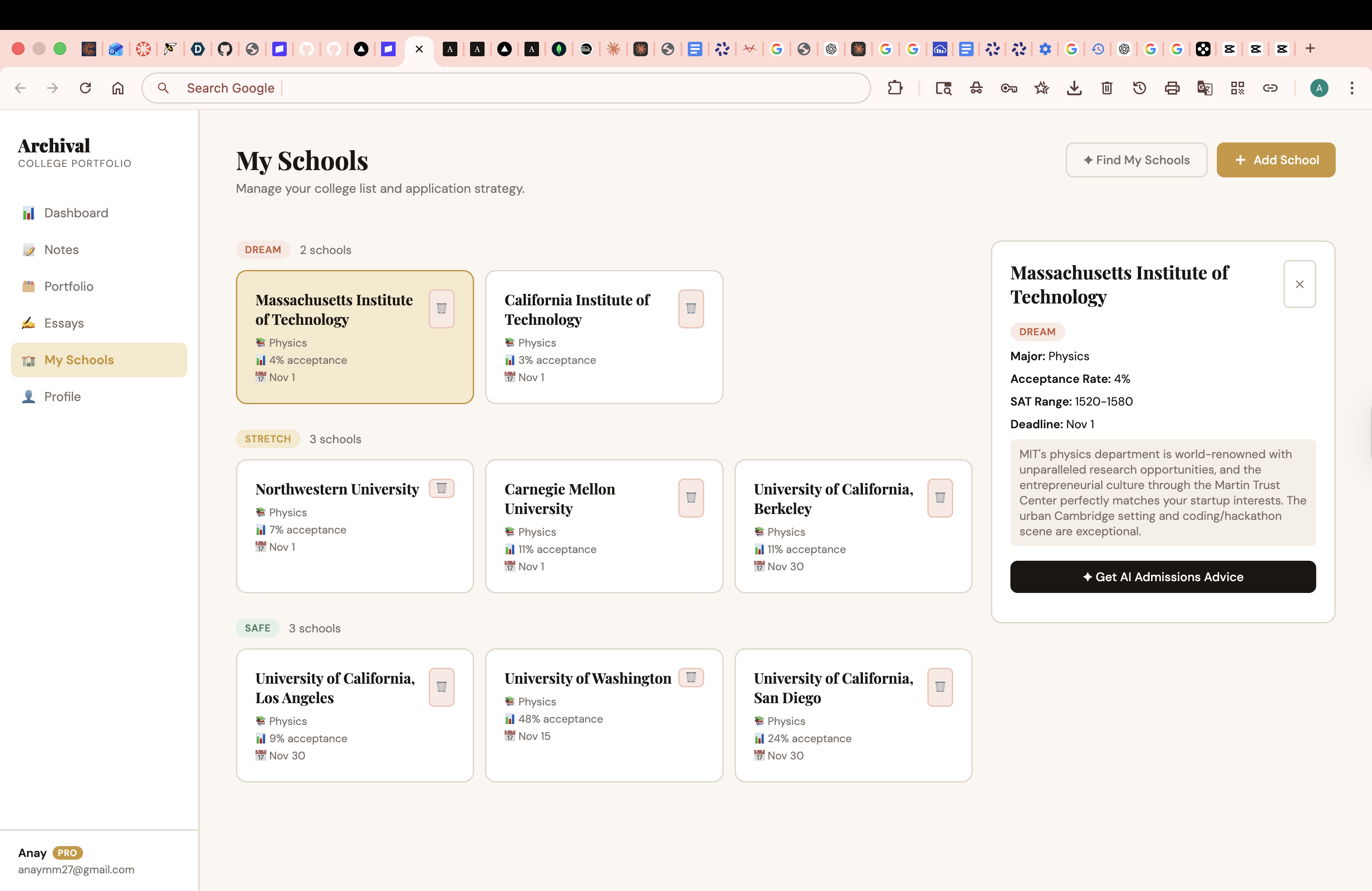 Archival is a full-stack college portfolio app that acts as a personal operating system for the college application process. Students can: