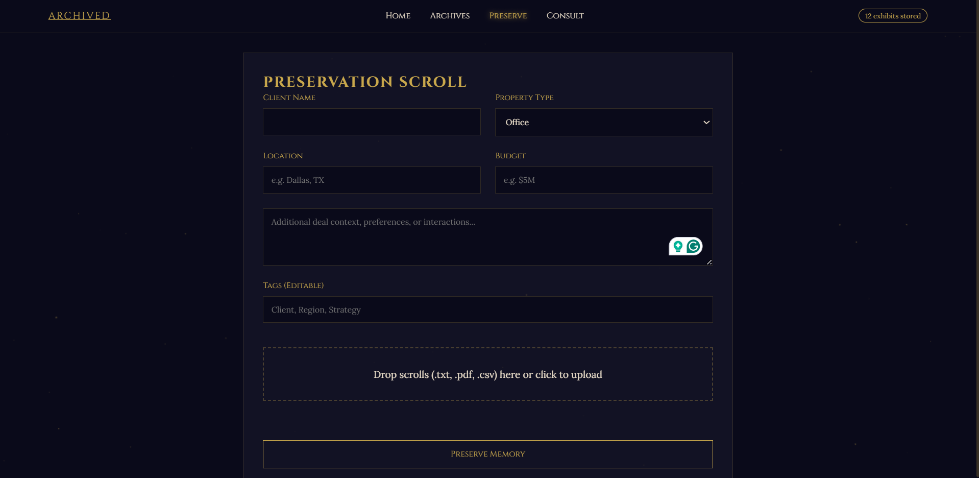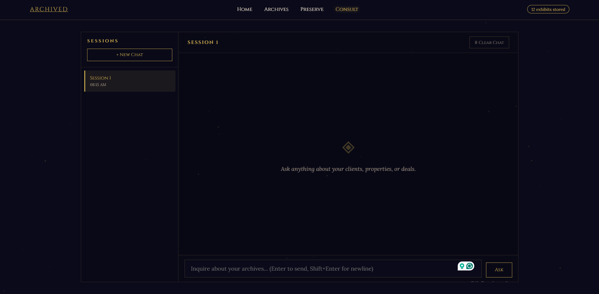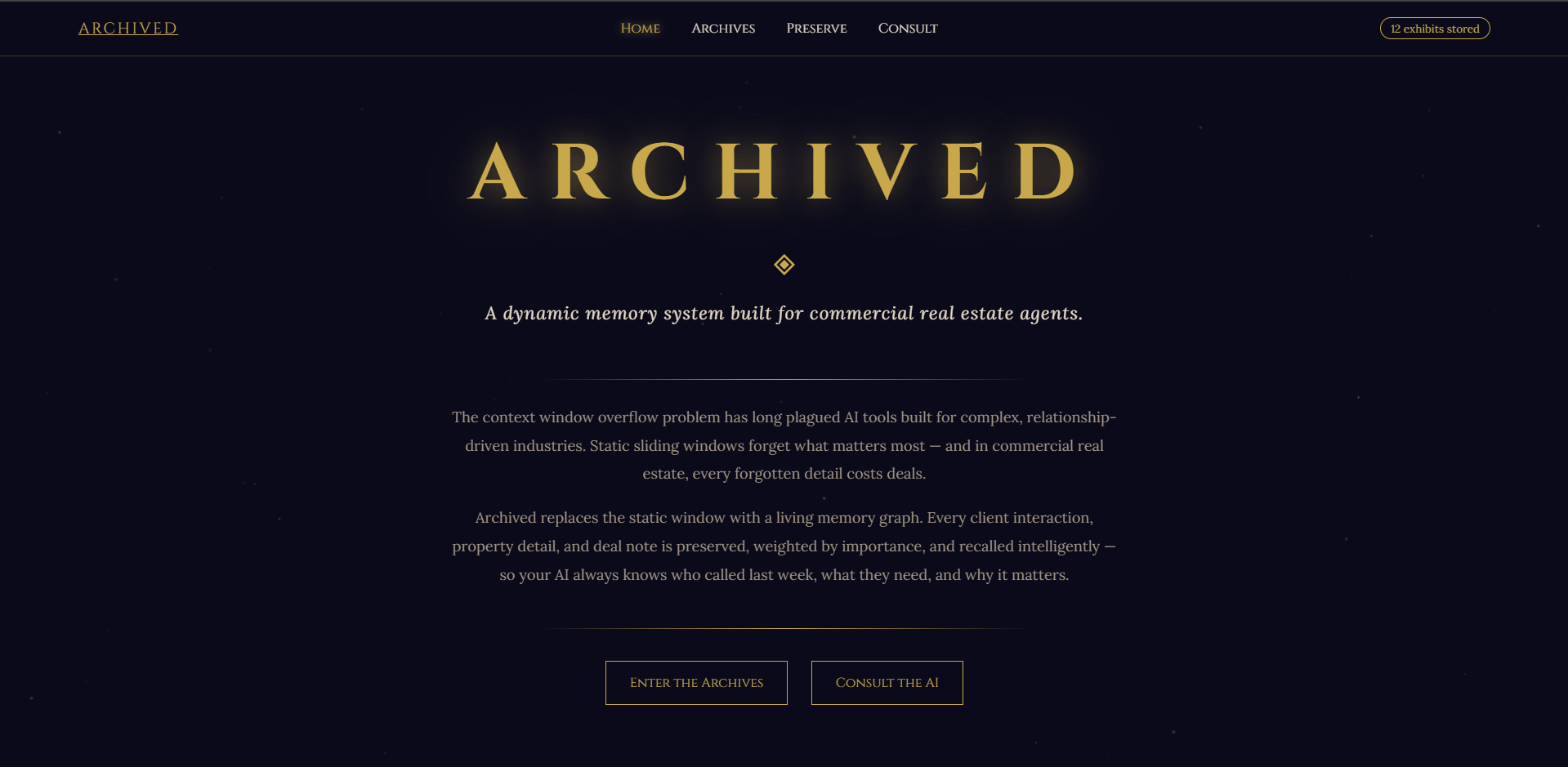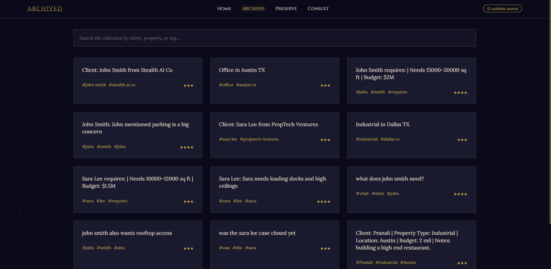 Archived is an AI-powered memory system designed for commercial real estate agents that preserves and recalls important information over time. Instead of losing past interactions, Archived stores them as connected pieces of information (like clients, properties, and requirements) so the AI can understand relationships, track history, and answer questions using relevant past context. In simple terms, it transforms AI from something that forgets into something that remembers.