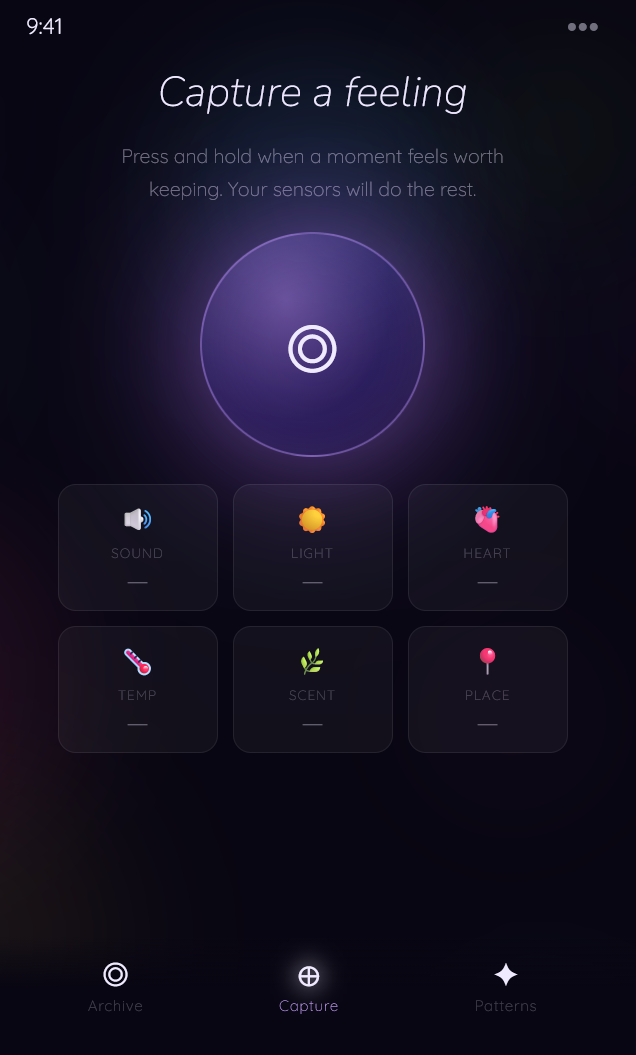 We aim to build an application that records a “sensory signature” for important experiences by measuring environmental inputs such as sound, light, movement, scent patterns, and location using a wearable device and smartphone sensors.