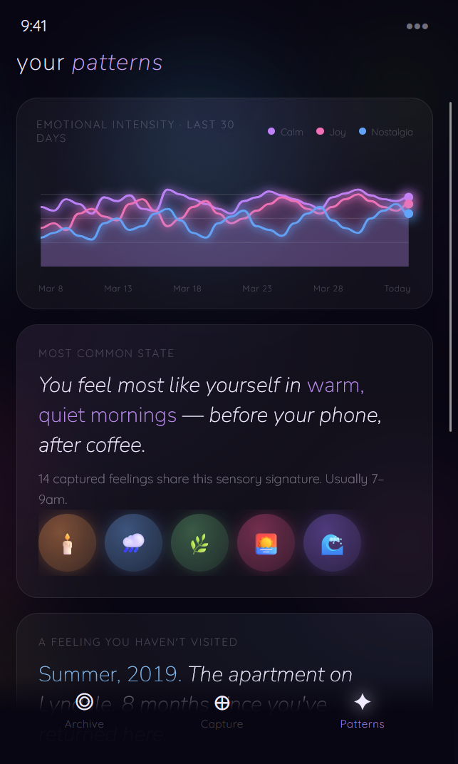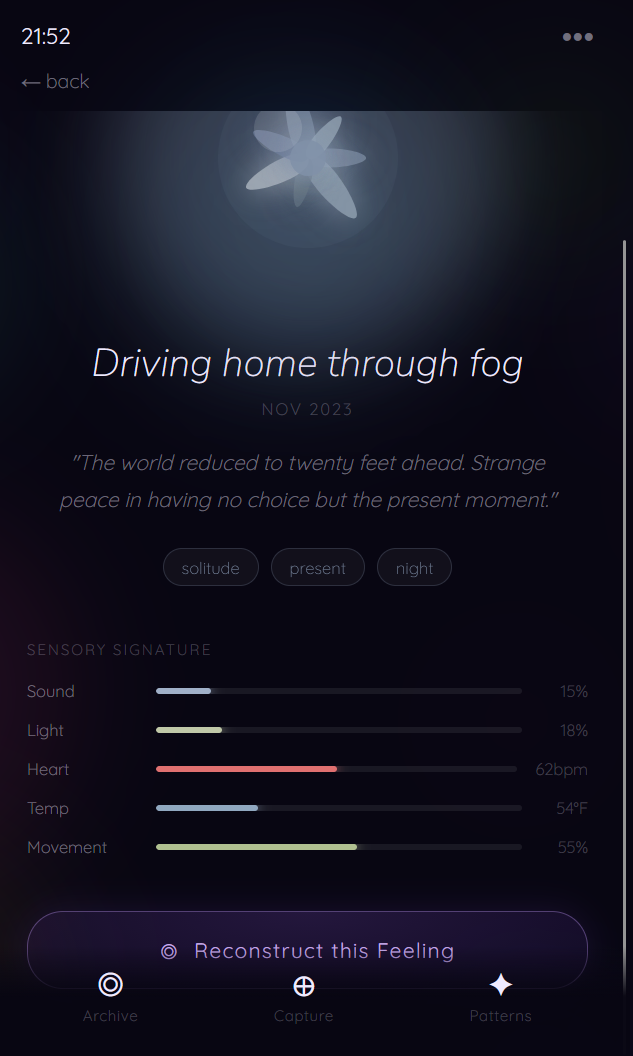 Our goal is to design a tool that captures, quantifies, and recreates the sensory environment surrounding meaningful moments in order to strengthen memory recall and support behavioral change.