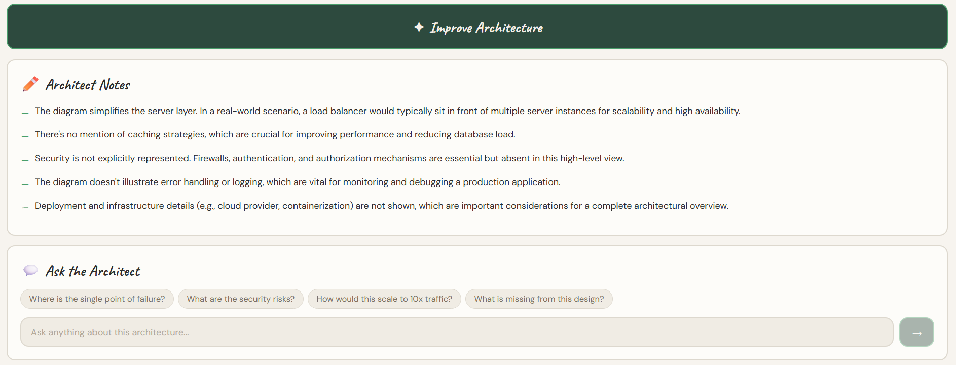 - AI-generated architecture improvement suggestions