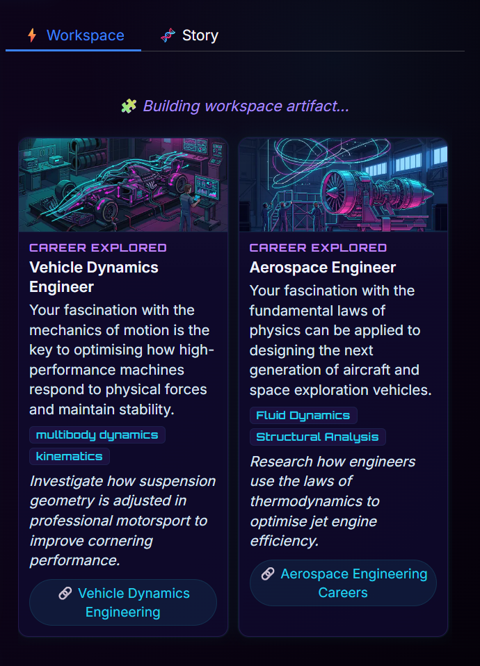We wanted to create a more engaging way for young people to explore real careers --- one that begins with their curiosity and turns it into a personalized journey of discovery.