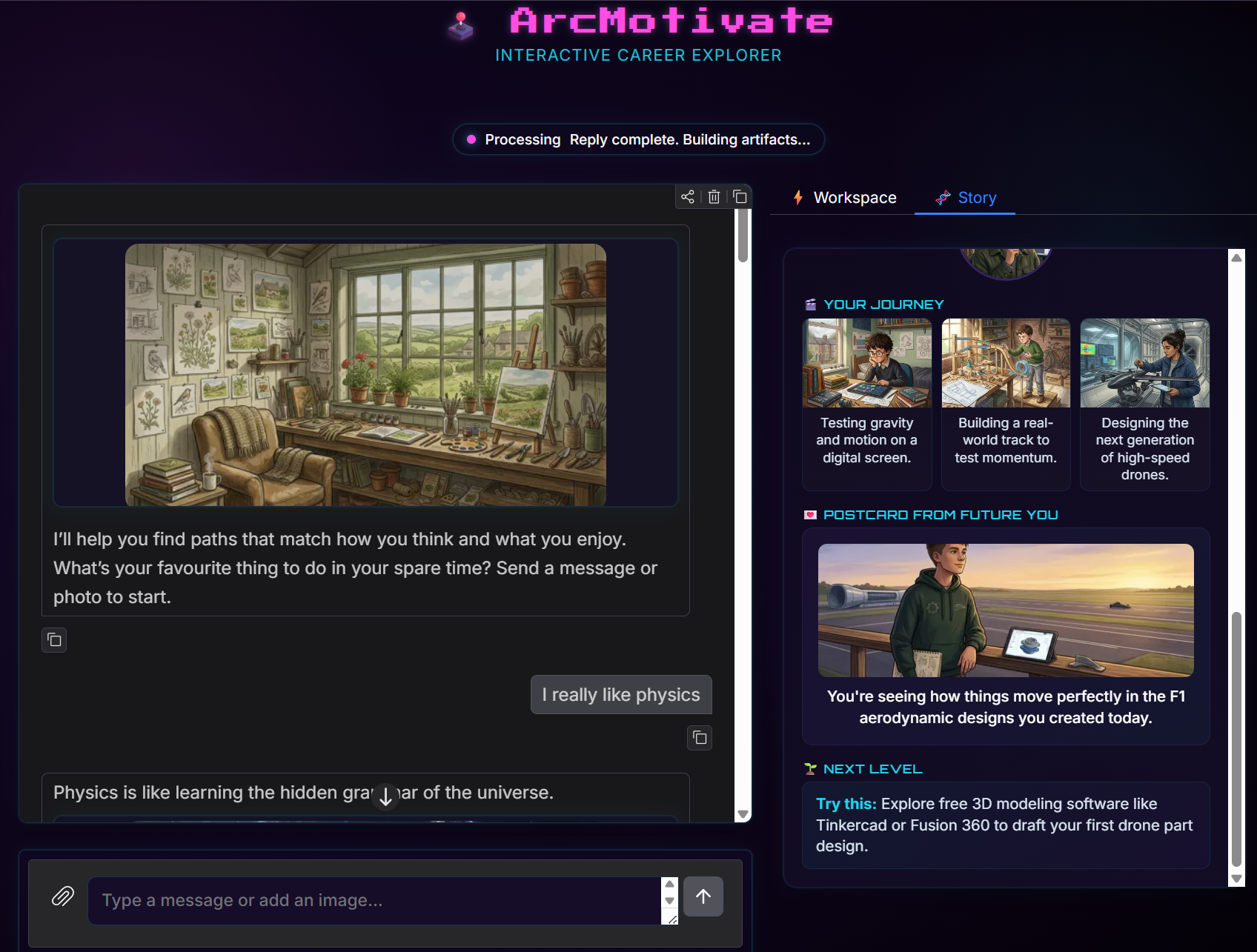 ArcMotivate is an interactive career exploration tool that uses multimodal AI to help young people discover potential career paths based on their interests, hobbies, and conversations.